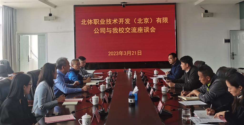 会上,副院长聂真新对best365基本情况进行介绍;北体职业技术开发(北京)有限公司董事长王伟对公司情况进行介绍,双方就体育产业、实训实习基地、科研、教材等方面进行交流;双方与会人员就推动产教高效融合、开展现代学徒制办学模式、教材、科研等问题展开交流。