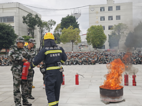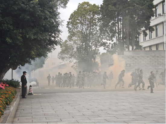 消防演练环节中,随着急促的警铃声响起,全体新生在宿管和承训教官的正确指引下,按照火场逃生的规范及动作要领,快速、有序的全员疏散到室外空旷地带。结束后,官渡区消防救援大队的教员首先为全体师生开展了火场灭火、救援实操模拟演练。其次,深入讲解了手提式干粉灭火器、室内消火栓箱、灭火毯、防毒面具等消防设施器材的使用方式,以及日常生活中如何防范消防安全隐患并正确的处置突发情况。最后,细致指导学生使用灭火器开展灭火实操。