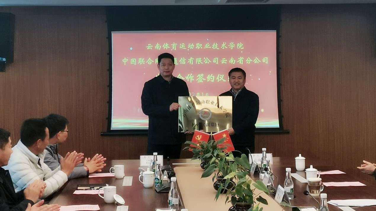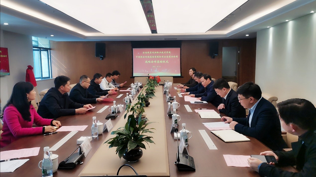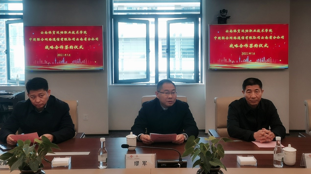 云南联通总经理伍昭祥代表企业进行致辞,中国联通作为数字技术融合创新的排头兵,在信息化内涵建设、技术实力方面有着优势,在落实云南打造世界一流“三张牌”、“数字云南”和体育强省战略中,校企要积极探索和落地在数字校园建设、产业联盟、大健康产业学院、数据中心、人才培养、科研成果转化等各方面的项目,切实提升体育职业教育为社会、行业、企业服务的功能,为企业培养更多高素质体育技术技能型人才,同时也为学生实习、实训、就业提供更多机会和更大空间。