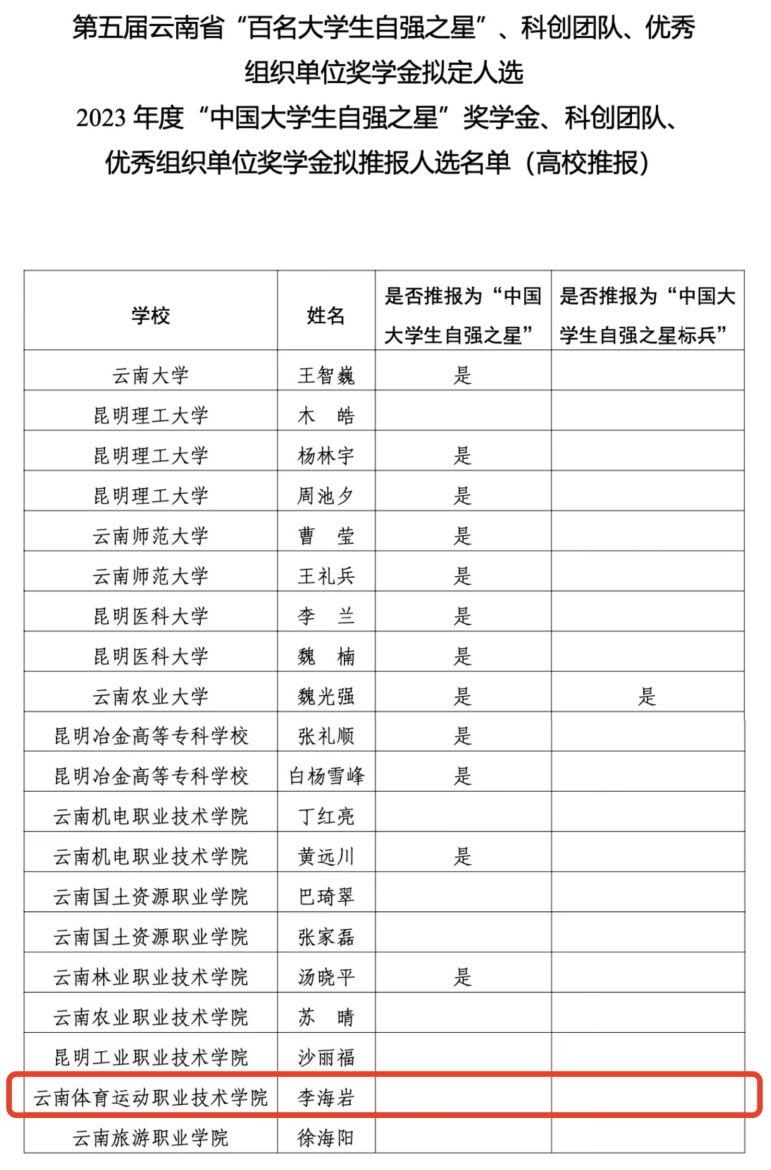 2024年3月,共青团云南省委、云南省学生联合会、云南省青少年发展基金会、华能澜沧江水电股份有限公司联合开展了寻访第五届云南省“百名大学生自强之星”活动,并择优推报参评2023年度“中国大学生自强之星”奖学金。经各高校团委、各州(市)团委推荐,省级评委会评审等环节,best3652022级体育教育学院体育教育5班李海岩同学获评2023年度“云南省大学生自强之星”,鼓舞了广大体职青年在新时代新征程上踔厉奋发,勇毅前行!