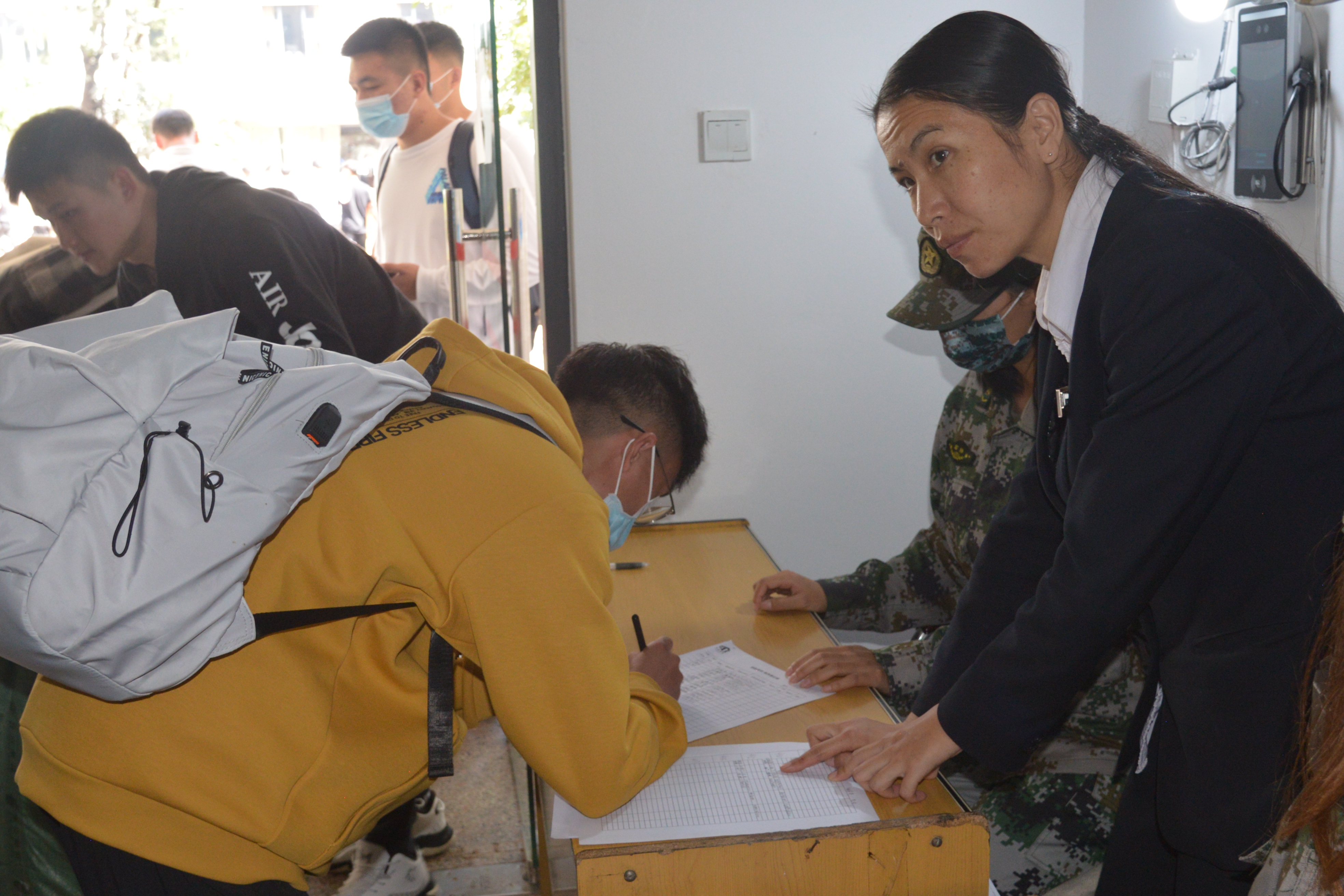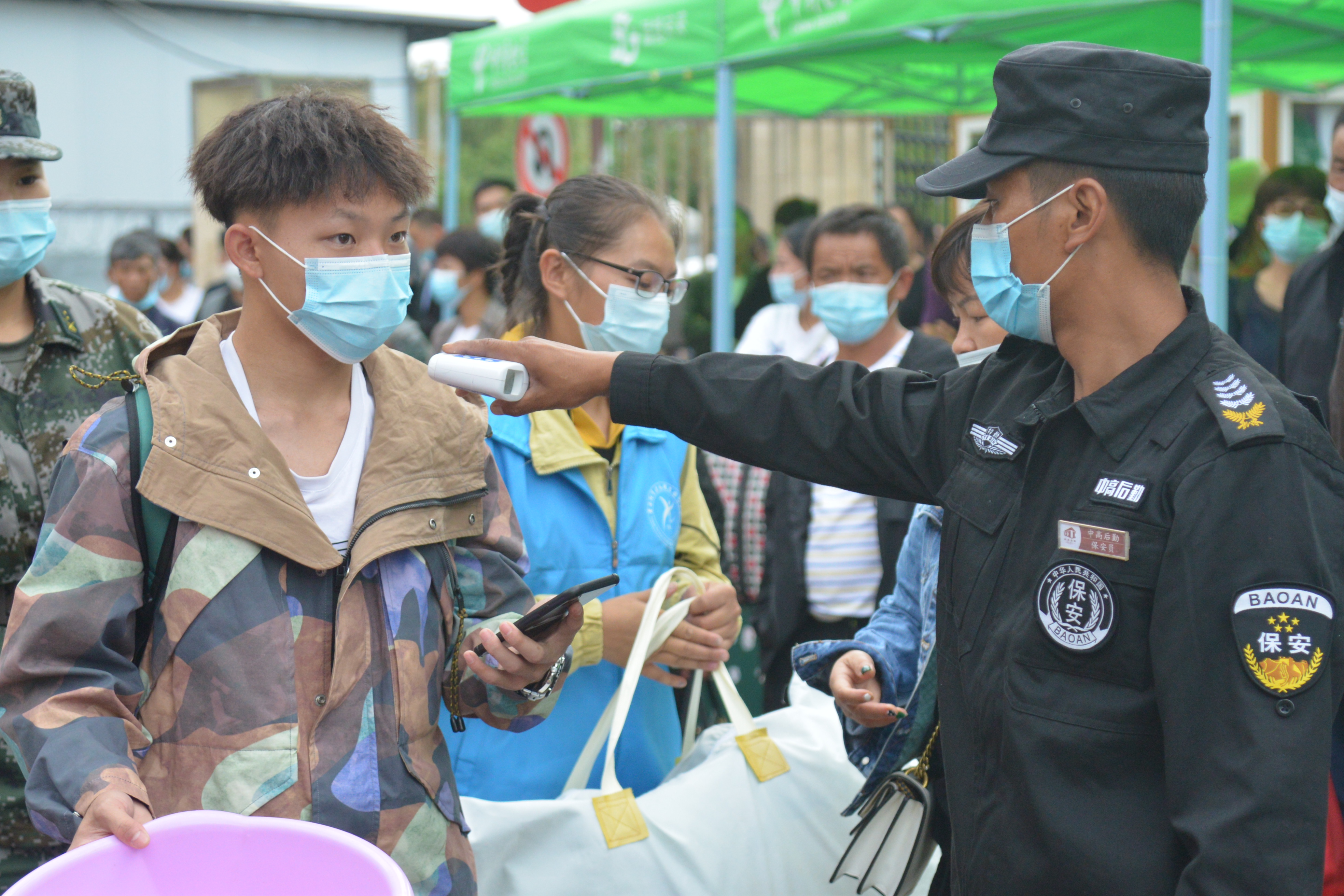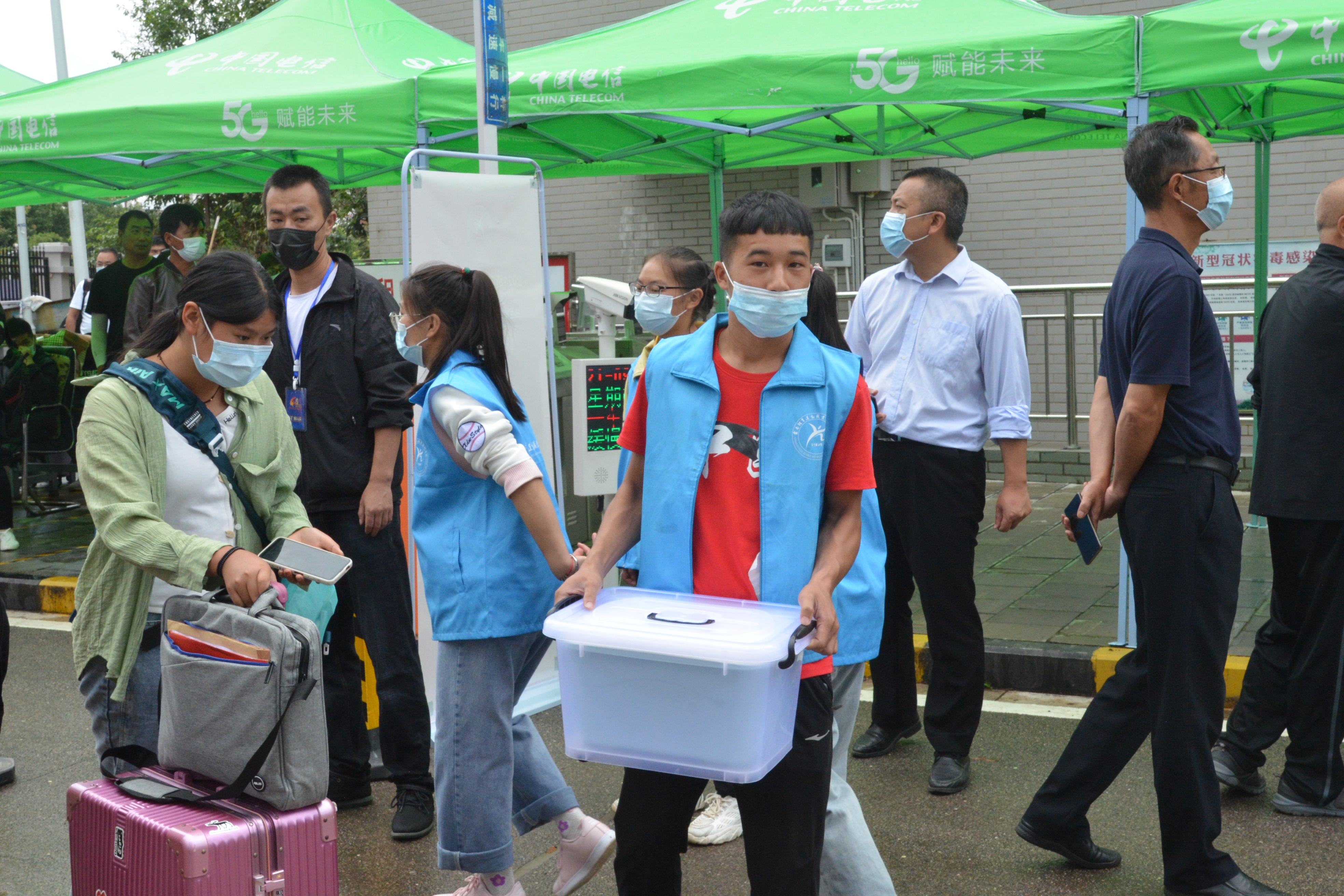 “叔叔阿姨请留步,您放心,把行李交给我们就行!” “同学你好!请出示核酸检测证明、健康码和行程码,测温无异常后进入校门。”“注意脚下,小心积水!报到登记请随我来,这边有序排队……”