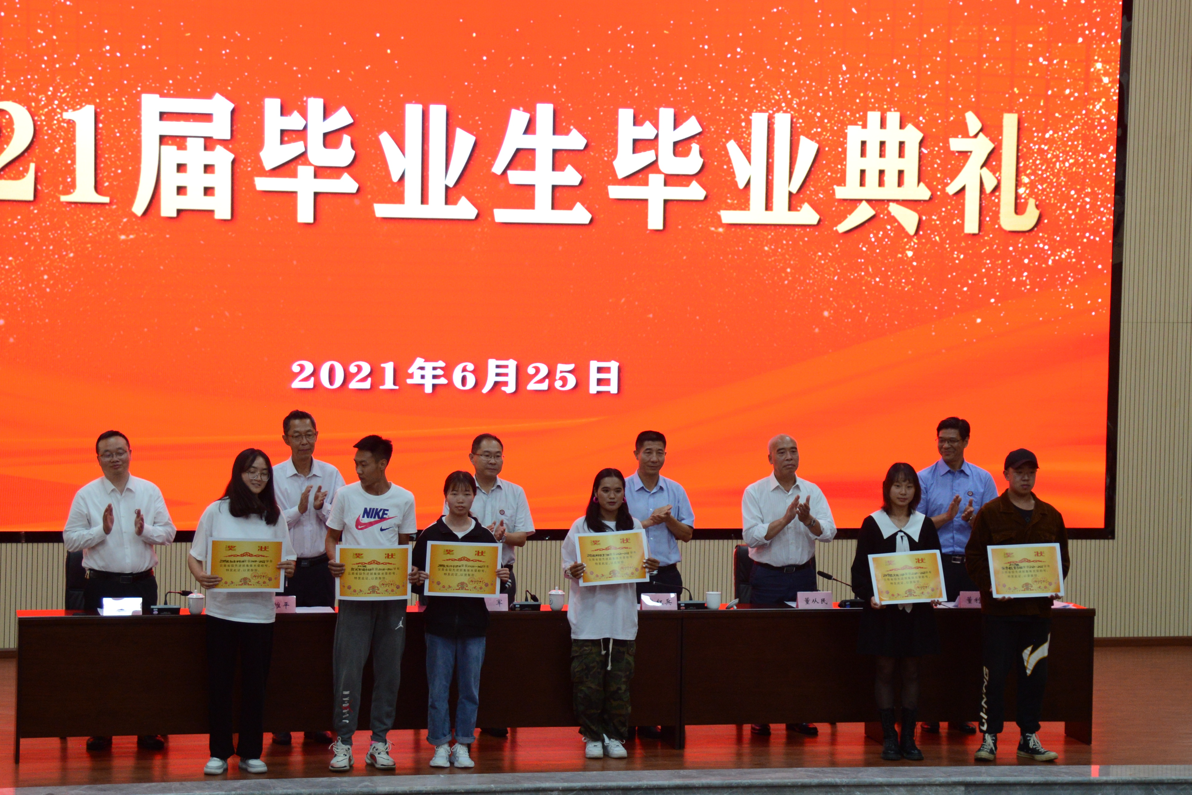 会上,党委书记缪军同志宣读了省委教育工委、省教育厅公布的2020-2021学年高校省级三好学生、优秀学生干部、先进班集体及优秀毕业生名单。在全场师生共同见证下,学院领导为优秀毕业生代表颁发毕业证书,毕业生依次上台接过毕业证书,在这难忘的时刻,大家分享喜悦,互相勉励,由衷自豪。