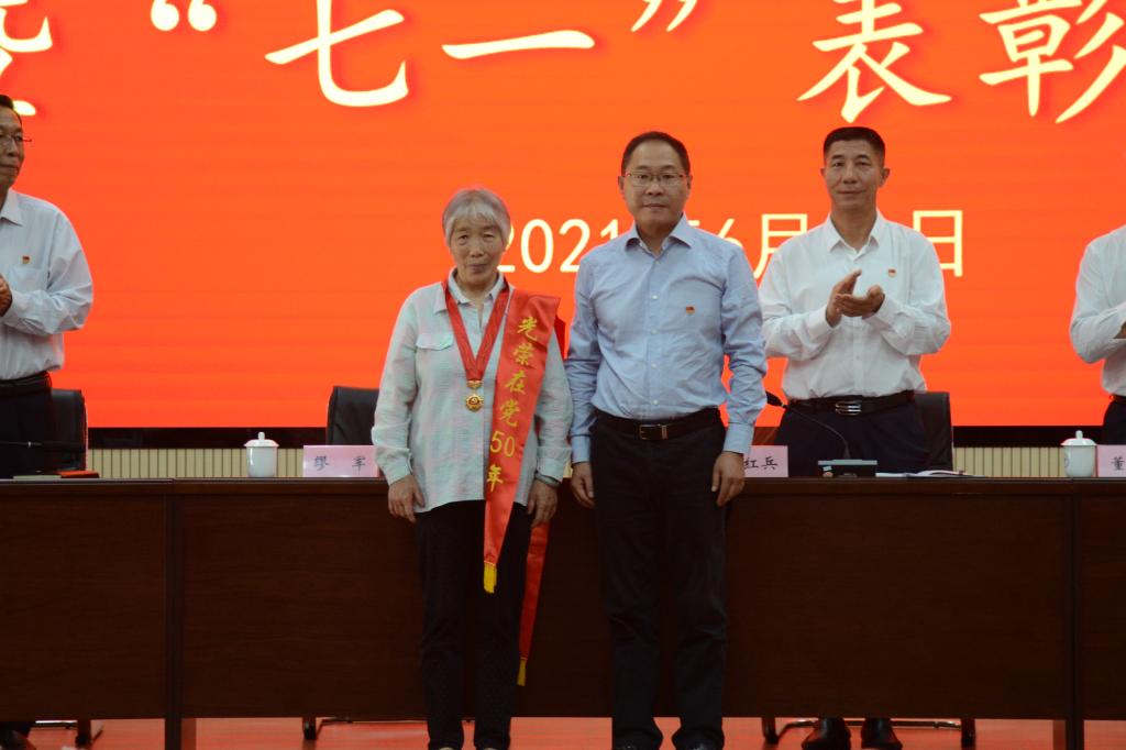 (党委书记缪军为老党员代表冯萍颁发“光荣在党50年”纪念章)
