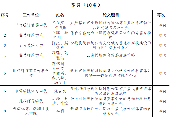 近日,云南省教育厅公布《云南省学校少数民族传统体育科学论文征集评比活动获奖名单》,经严格评审,最终评选出获奖论文140篇。best365竞技体院院长李晋龙老师撰写的论文《反思与重构:新冠疫情防控背景下的边疆民族地区健康教育体系》荣获大学组一等奖,李明老师撰写的论文《云南省山地户外运动与少数民族传统体育融合探索研究》荣获大学组二等奖,潘泽凯、杨林老师撰写的论文《后疫情时代云南边疆地区民族传统体育与全民健身深度融合发展研究》荣获大学组三等奖,张朋朋老师撰写的论文《云南省少数民族体育发展历史研究》荣获大学组三等奖。