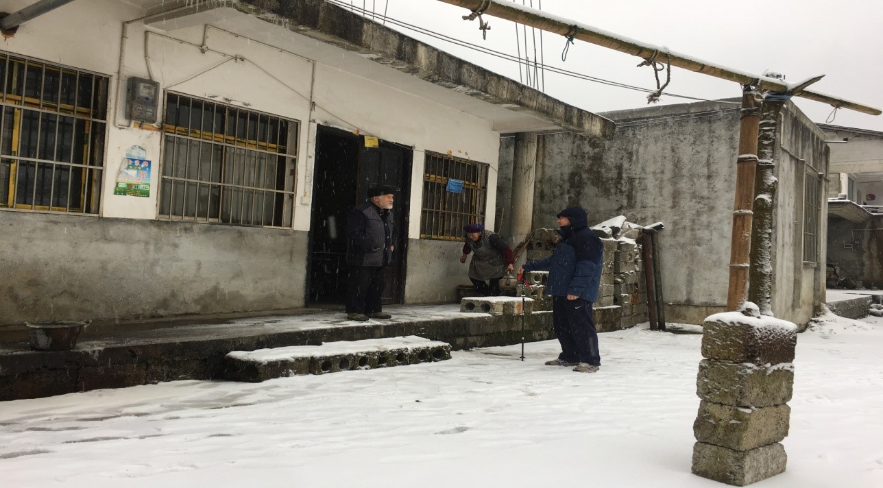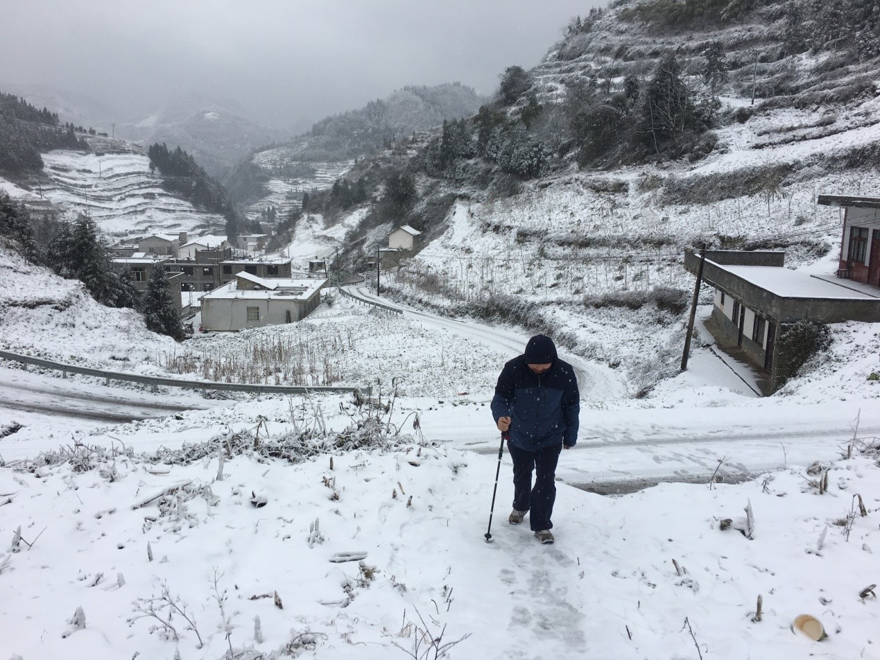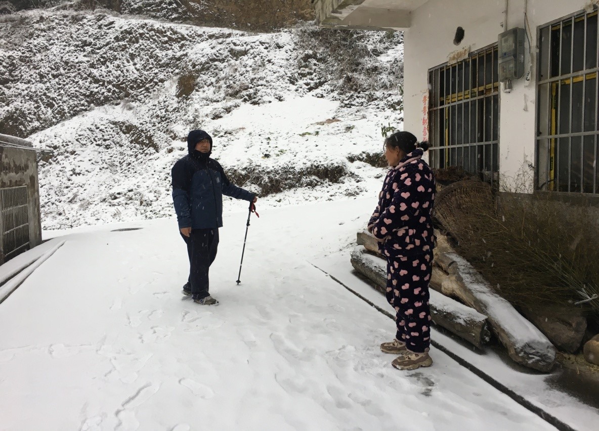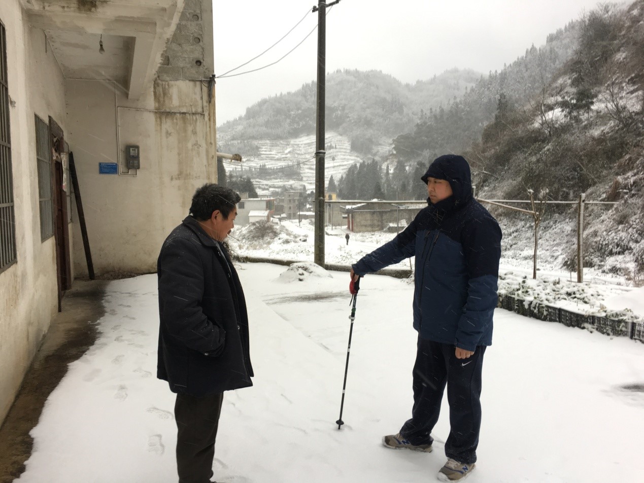 1月10日下午,best365驻村工作队员受学院委托,在漫天飞雪中,踏着结冰的路面去走访白孝伦等几位老人。