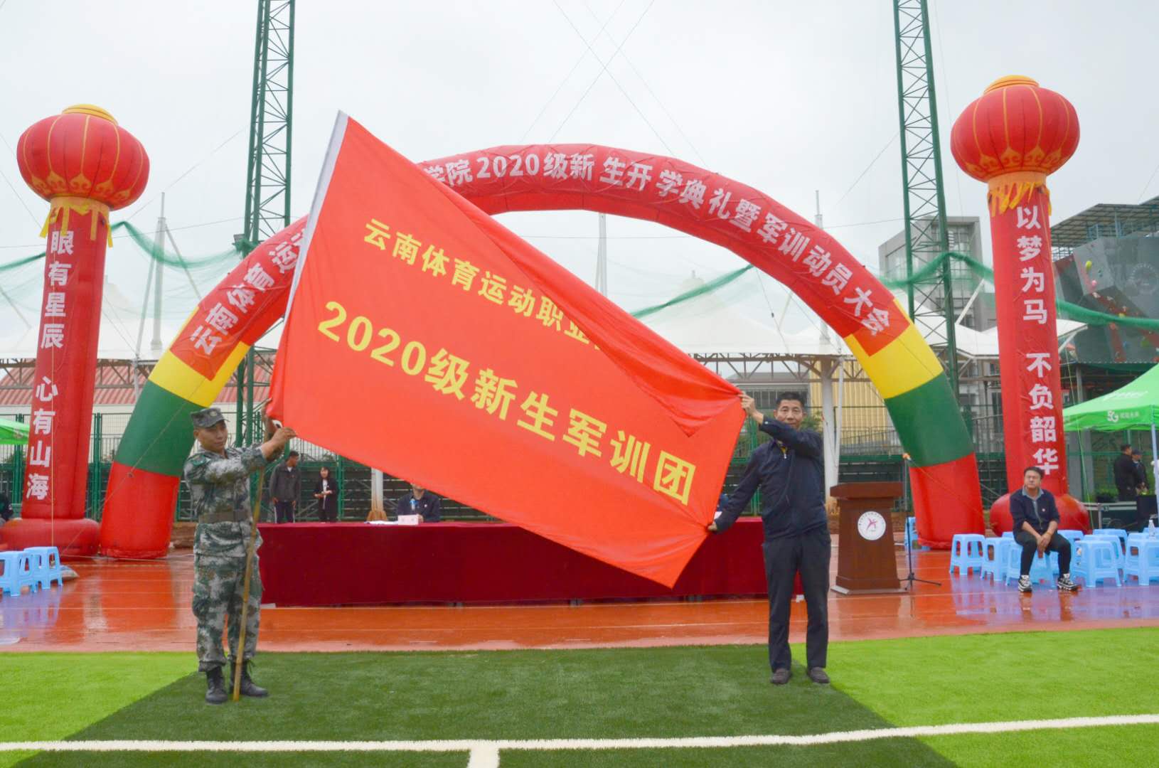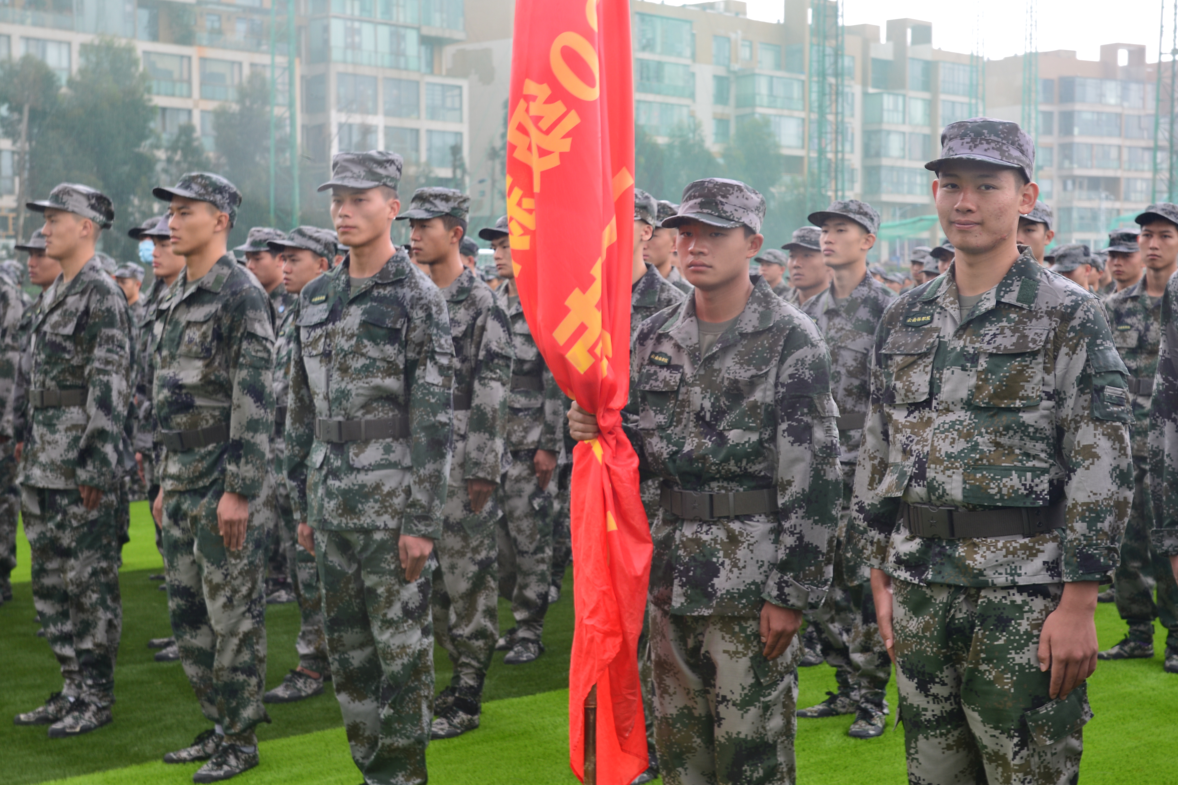 校徽佩戴完毕,院长为2020级新生军训团授旗,鼓励军训团的成员们在军训中要刻苦训练,力争在汇报演出上展现出优良的训练成果。