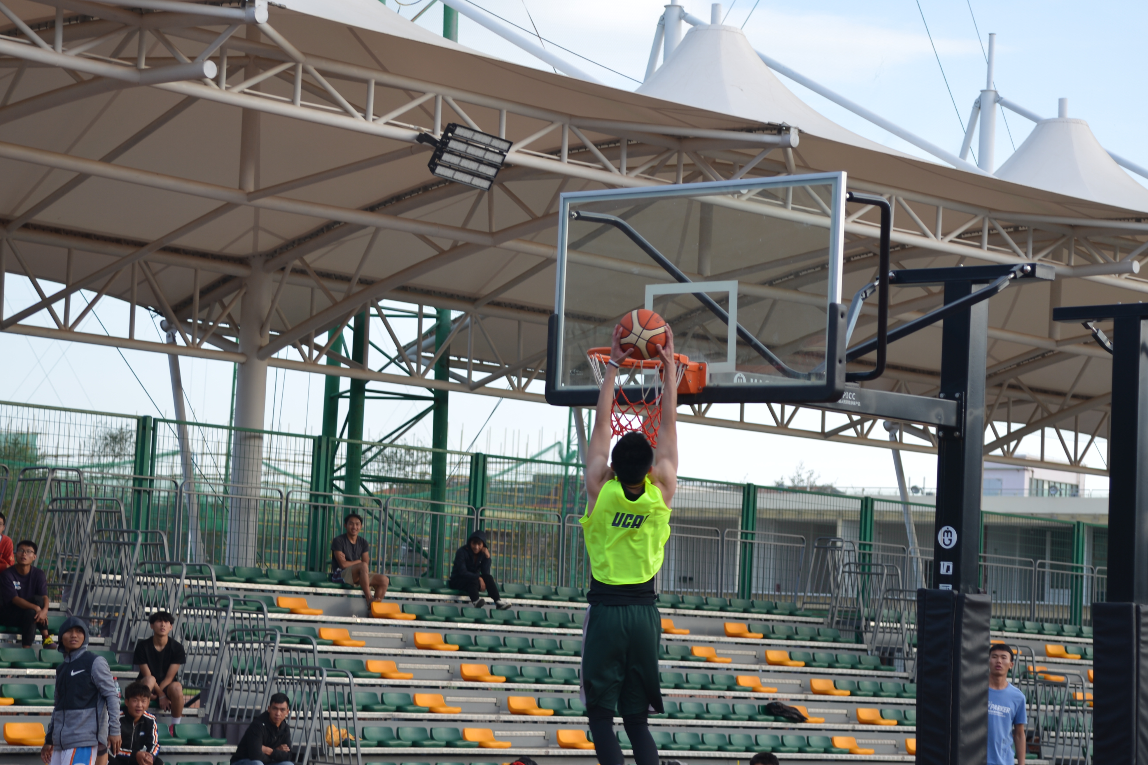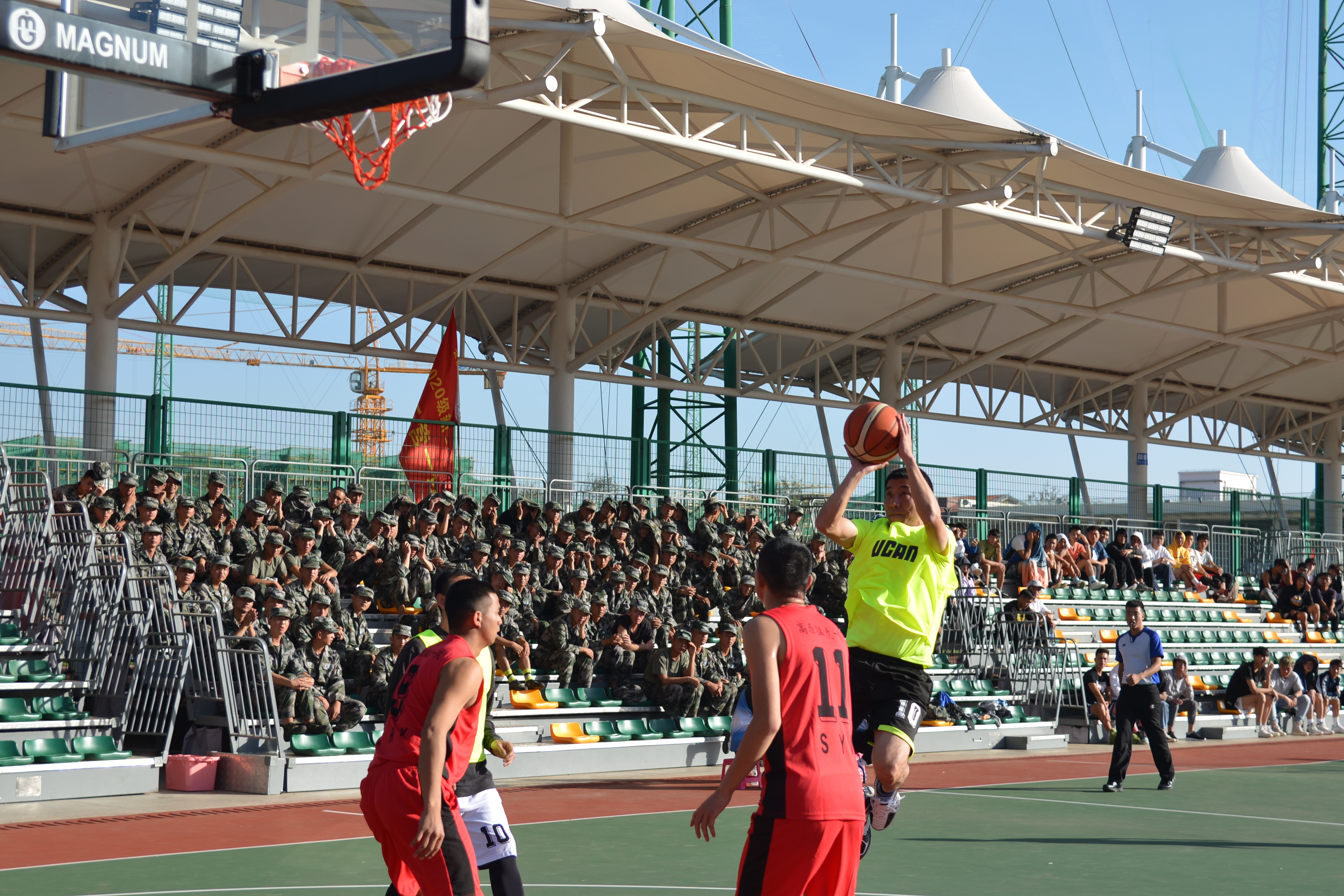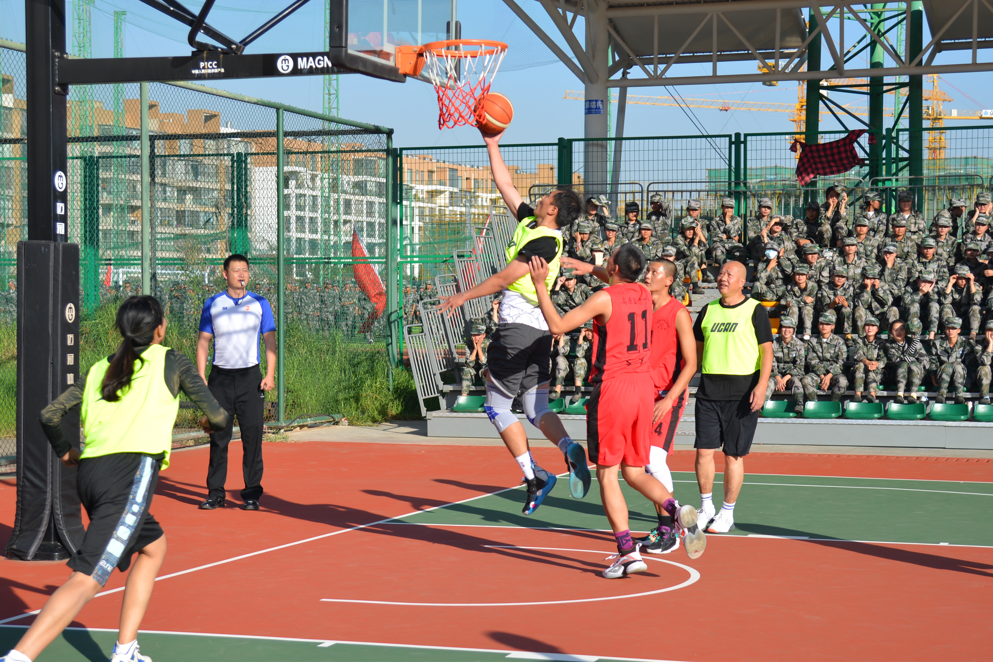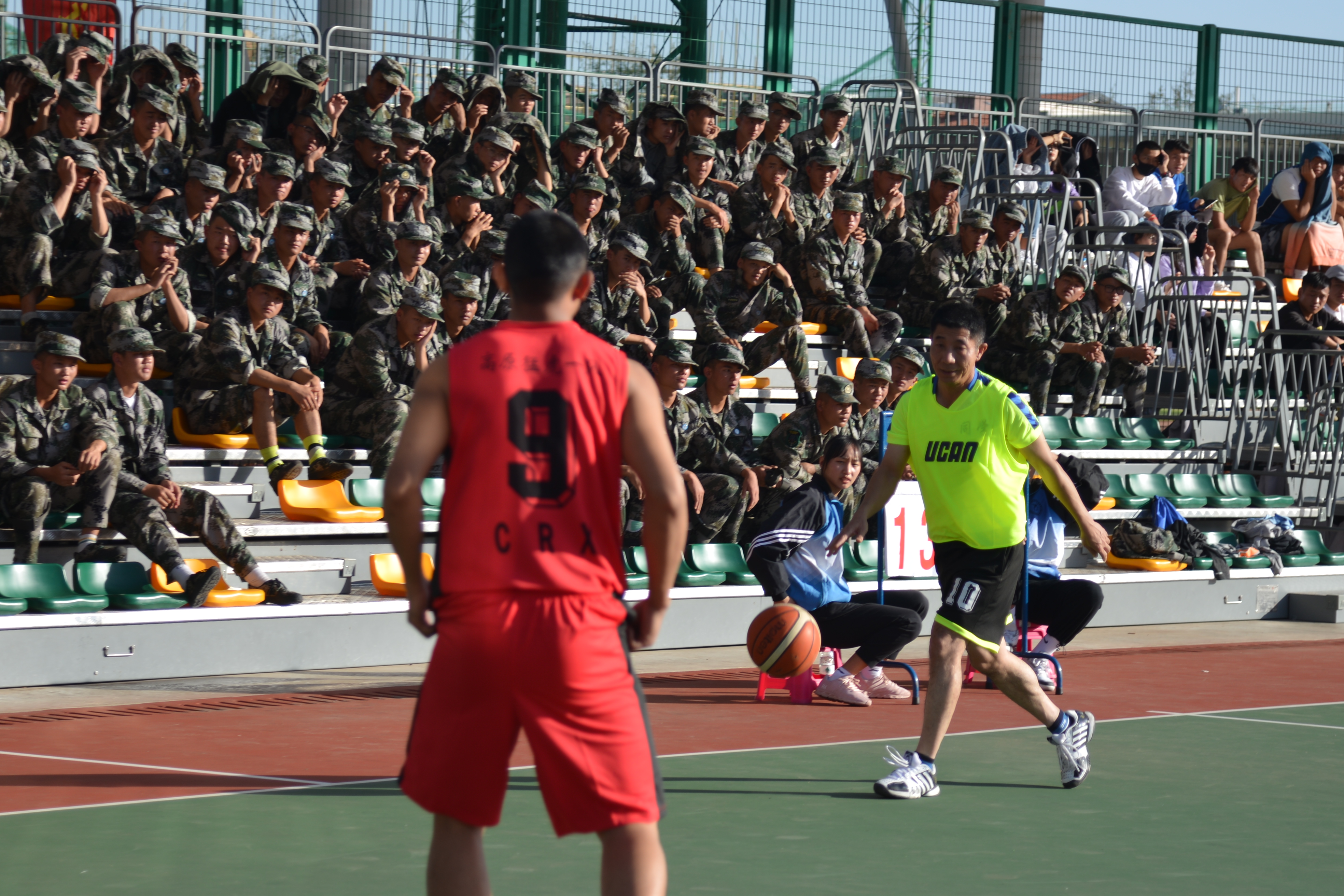 比赛开始前,双方代表队队员在赛场上互相致意。中场跳球以后,比赛正式开始。上半场的比赛,2020级新生军训团代表队攻势势如破竹,先后打出了流畅的配合,三分远投、快攻暴扣各样绝活轮番上演,比分很快就被拉开。下半场比赛开始,教师代表队迅速找到比赛节奏,在运动战和阵地战中接连得分,迅速迫近了比分,期间教师代表队还上演了精彩绝伦的扣篮,惹得在场观众拍手称赞,连连叫好。