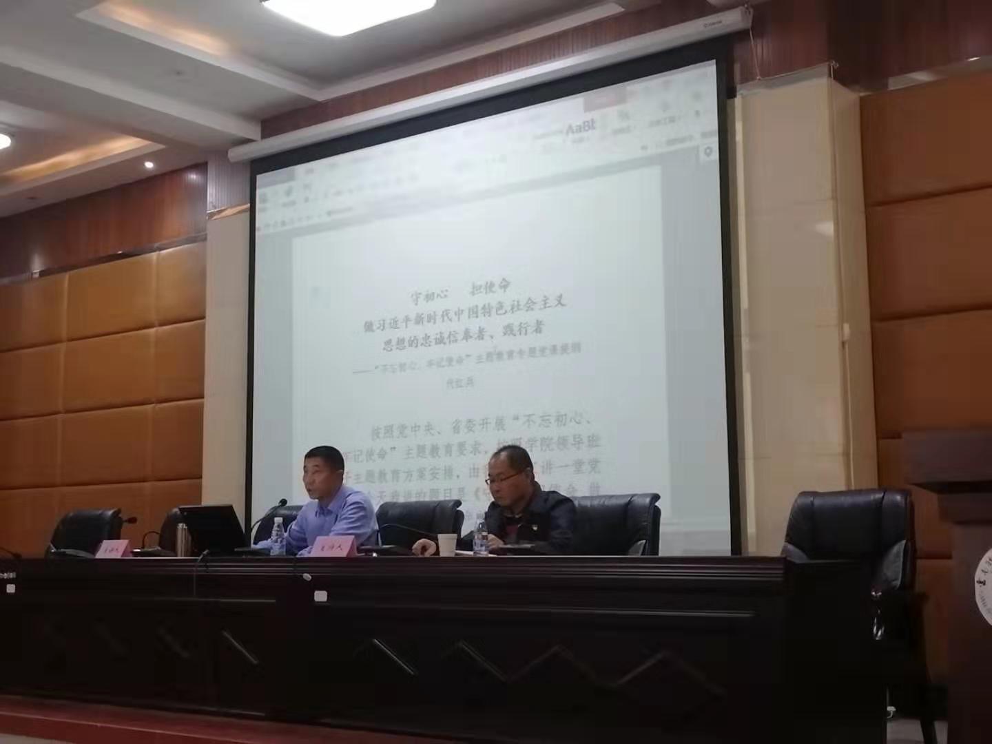 学院党委副书记、院长代红兵围绕“习近平新时代中国特色社会主义思想是当代中国马克思主义、21世纪马克思主义”和“守初心、担使命,做习近平新时代中国特色社会主义思想的忠诚信奉者”两部分,从主题教育的重要意义、具体目标和根本任务等角度对积极践行主题教育进行了指导。他回顾了中国共产党从初心出发、担当使命的壮阔历程,深入阐释了共产党人的“初心”是什么,同时联系自身学习习近平新时代中国特色社会主义思想认识、学院工作实际以及主题教育调研成果向党员们讲解了为什么要不忘初心、怎样做到不忘初心,如何用实际行动践行使命。