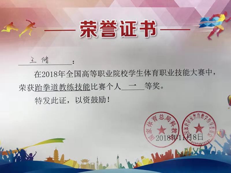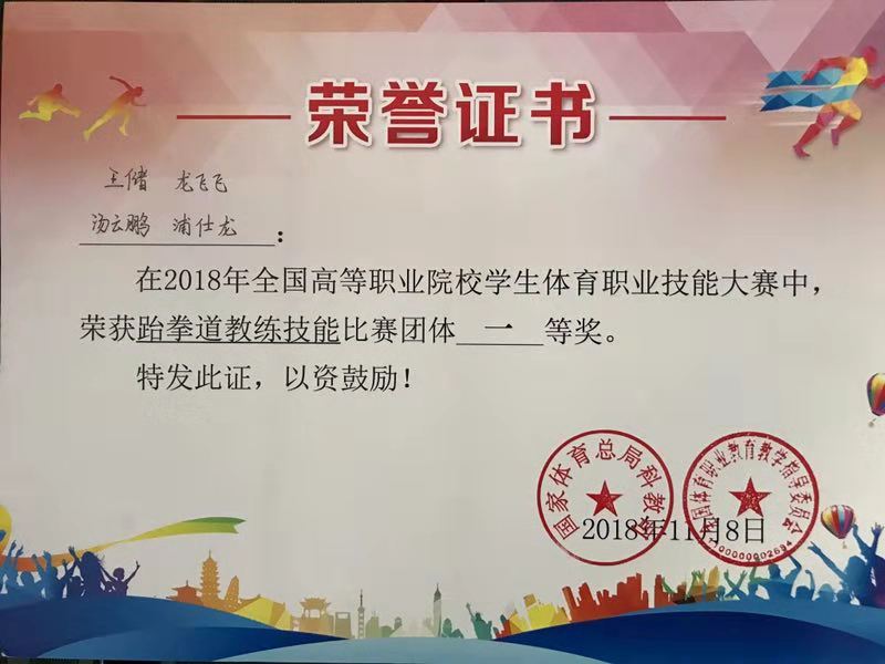 通过前期的刻苦训练,我院跆拳道代表队在比赛中取得了优异成绩。斩获了五个第一名的好成绩。分别是跆拳道教练技能比赛团体一等奖总分第一名,汤云鹏获得男子个人一等奖个人成绩第一名,浦仕龙获得男子个人一等奖个人成绩第三名,王储获得女子个人一等奖个人成绩第三名,龙飞飞获得女子个人一等奖个人成绩第四名的好成绩。此外,汤江云、杨爽,李祥枢获得了优秀指导教师的称号。