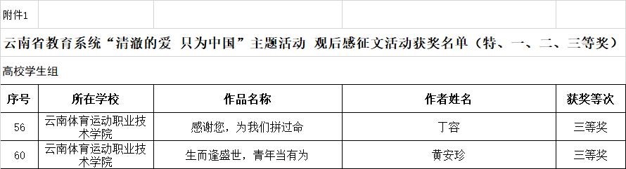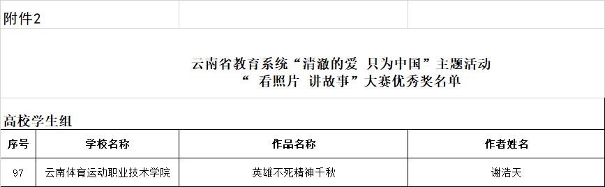 2022年10月19日,云南省教育厅发布了《云南省教育厅关于发布全省教育系统结果的通知》,best365中国官方网站学生工作部(处)选送的学生作品喜获佳绩。丁容同学的作品《感谢您,为我们拼过命》以及黄安珍同学的作品《生而逢盛世,青年当有为》在云南省教育系统“清澈的爱 只为中国”主题活动观后感征文活动中荣获三等奖;谢浩天同学的作品《英雄不死精神千秋》在云南省教育系统“清澈的爱 只为中国”主题活动“看照片 讲故事”大赛中荣获优秀奖。