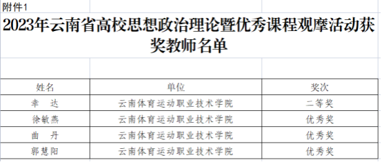 根据《中共云南省委教育工委关于公布2023年云南省高校思想政治理论课教学展示暨优秀课程观摩活动结果的通知》,best365马克思主义学院四名教师参赛,幸达老师荣获《形势与政策》课高职高专组教学展示二等奖,徐敏燕老师、曲丹老师、郭慧阳老师获分课程教学展示优秀奖。