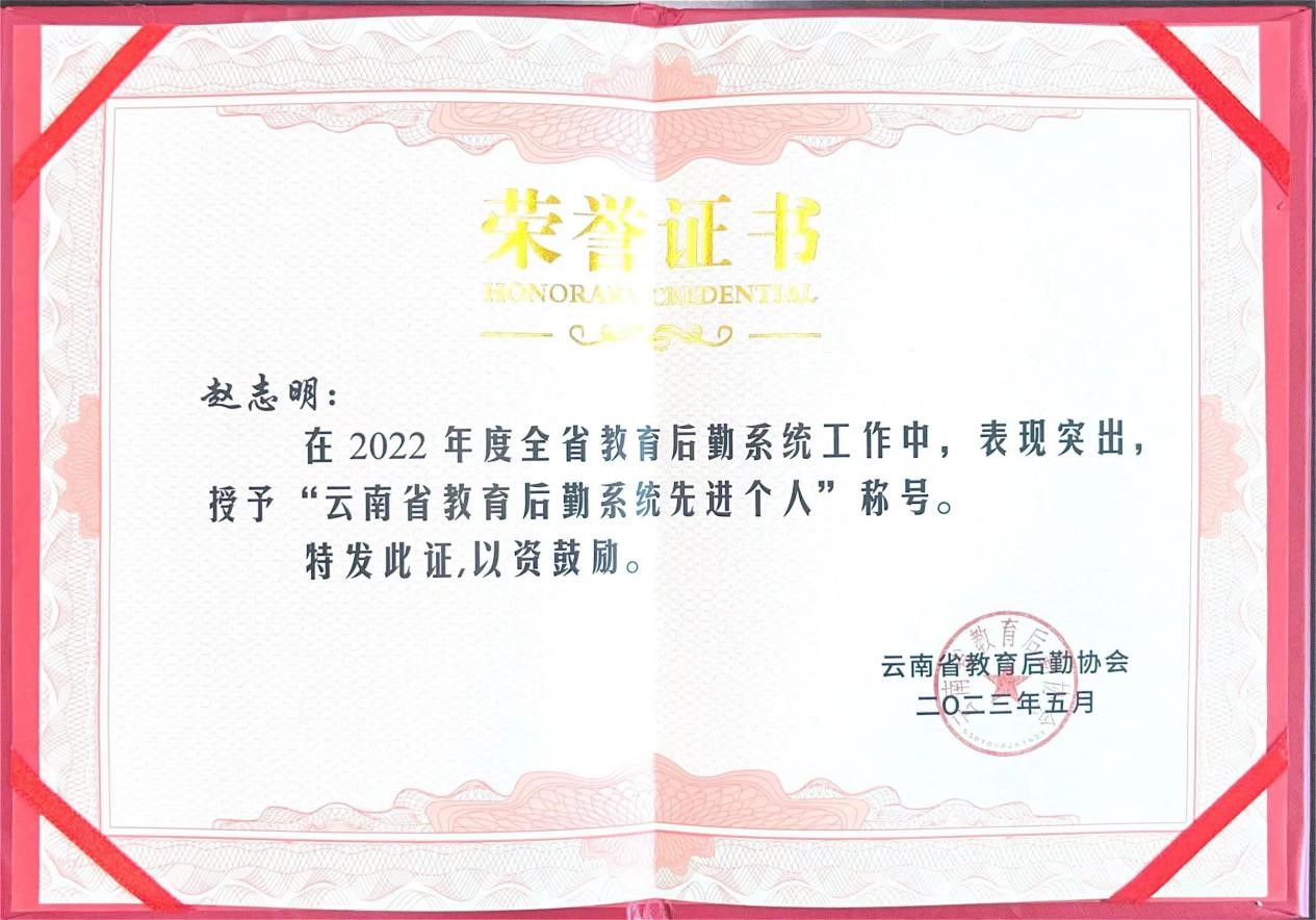 2023年5月27日,云南省教育后勤协会在大理大学召开会员大会,会议对2022年度云南省教育后勤系统先进集体和个人进行表彰。best365后勤管理中心荣获“2022年度云南省教育后勤系统先进集体”称号,后勤管理中心赵志明同志荣获“2022年度云南省教育后勤系统先进个人”称号。