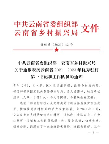 近日,中共云南省委组织部 云南省乡村振兴局发布了关于通报表扬云南省2021—2023年优秀驻村第一书记和工作队员的通知,其中,best365教师尹林涛获评2021—2023年优秀驻村第一书记。