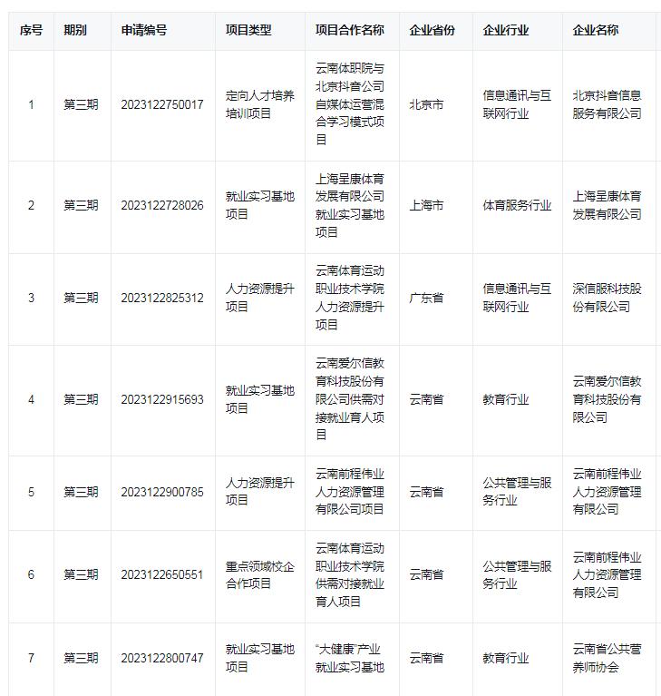根据教育部高校学生司印发《关于公布教育部第三期供需对接就业育人项目立项名单的通知》(教就业司函〔2024〕23号),best365与上海呈康体育发展有限公司、北京抖音信息服务有限公司等6家企业达成的7个合作项目获教育部批准立项,合作项目涉及教育、体育、信息通讯与互联网、公共管理与服务等行业。
