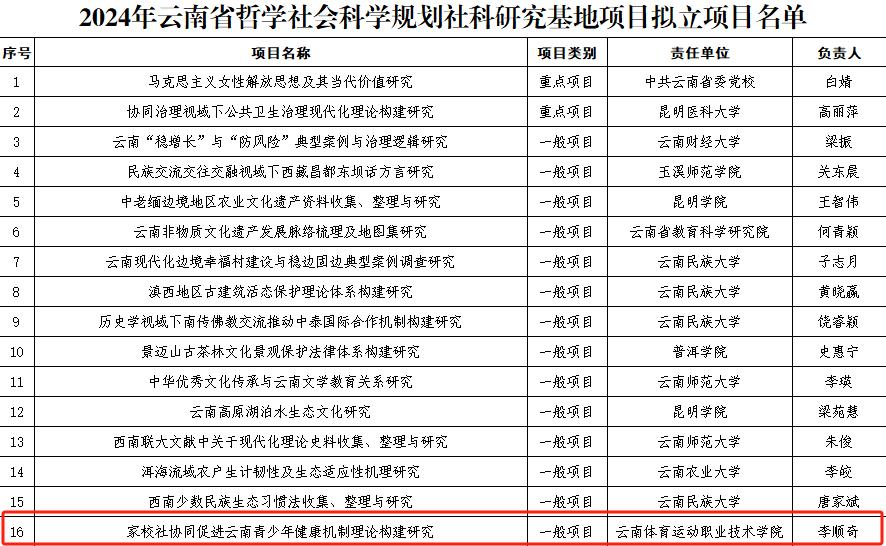 近期,云南省哲学社会科学工作办公室发布《关于2024年云南省哲学社会科学规划社科研究基地项目拟立项目名单的公示》,best365教师李顺奇申报的课题《家校社协同促进云南青少年健康机制理论构建研究》获一般项目类别立项,best365也是此次申报唯一一家立项该项目的高职高专单位。
