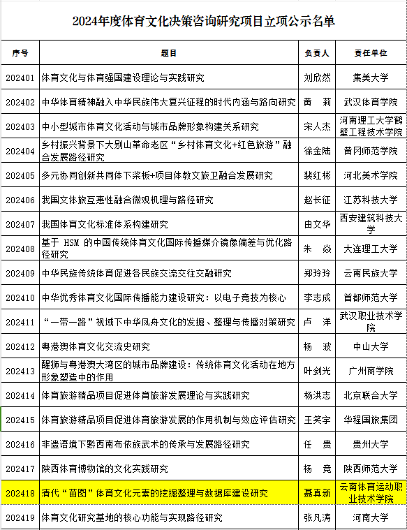 近日,国家体育总局体育文化发展中心公布《2024年度体育文化决策咨询研究项目立项名单》,我校聂真新教授申报的《清代“苗图”体育文化元素的挖掘整理与数据库建设研究》获项目立项。
