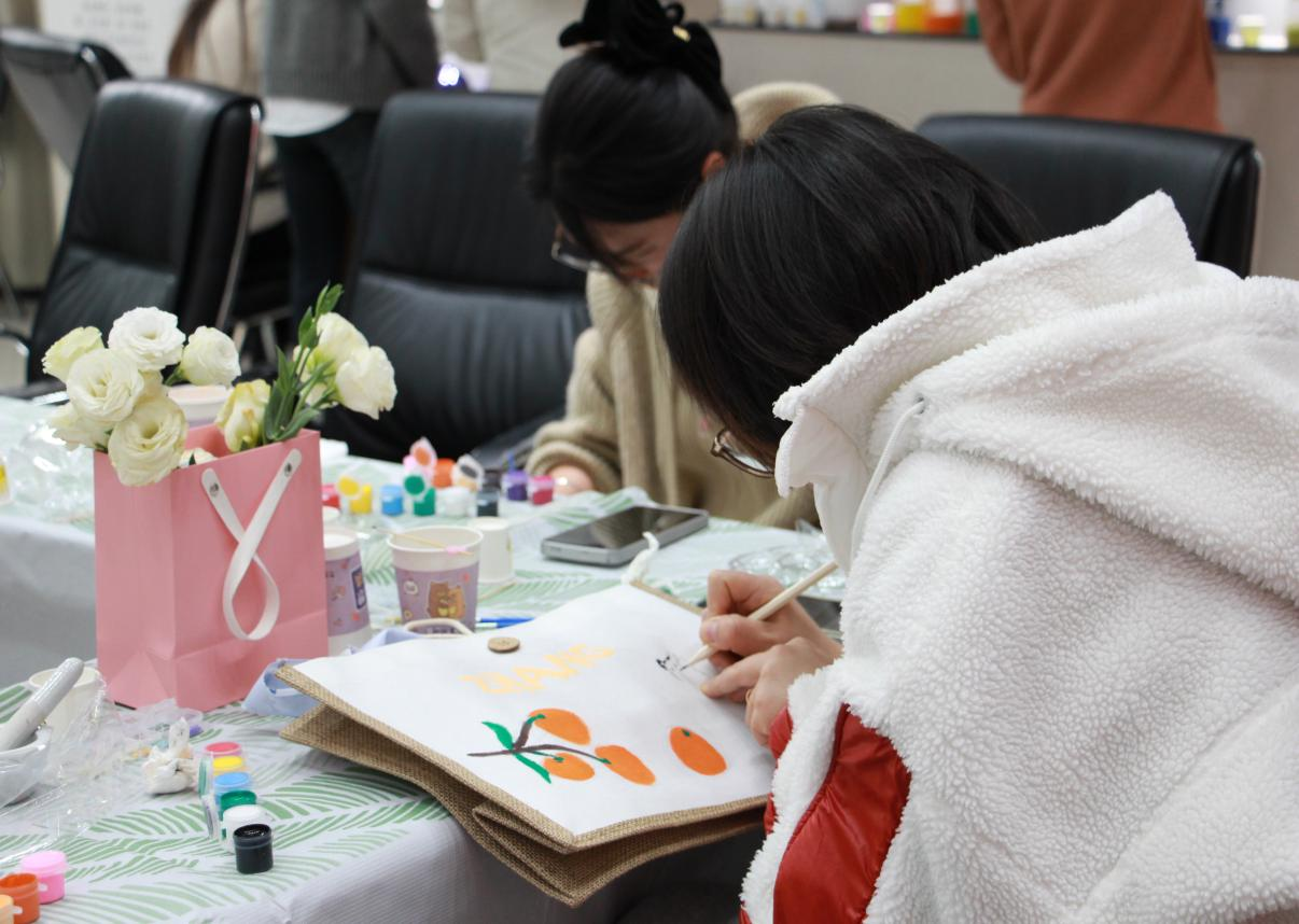 与此同时,“手绘帆布包”创意区同样热闹非凡。女教职工们以画笔为媒,将山水花鸟、校园风光等元素融入设计,原本素净的帆布包瞬间焕发绚丽色彩,成为兼具艺术性与实用性的个性作品。