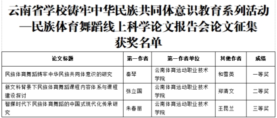 近期,省教育厅举办云南省学校铸牢中华民族共同体意识教育系列活动——民族体育舞蹈线上教学和竞赛活动,best365教师积极参加,在民族体育舞蹈线上科学论文报告会论文征集中斩获佳绩。秦琴、和雪英的参评论文《民族体育舞蹈铸牢中华民族共同体意识的研究》获一等奖,张立国、郑清文的参评论文《新文科背景下民族体育舞蹈课程内容体系与课程建设探讨》获二等奖,朱春丽、王昆兰的参评论文《智媒时代下民族体育舞蹈的中国式现代化传承研究》获三等奖。