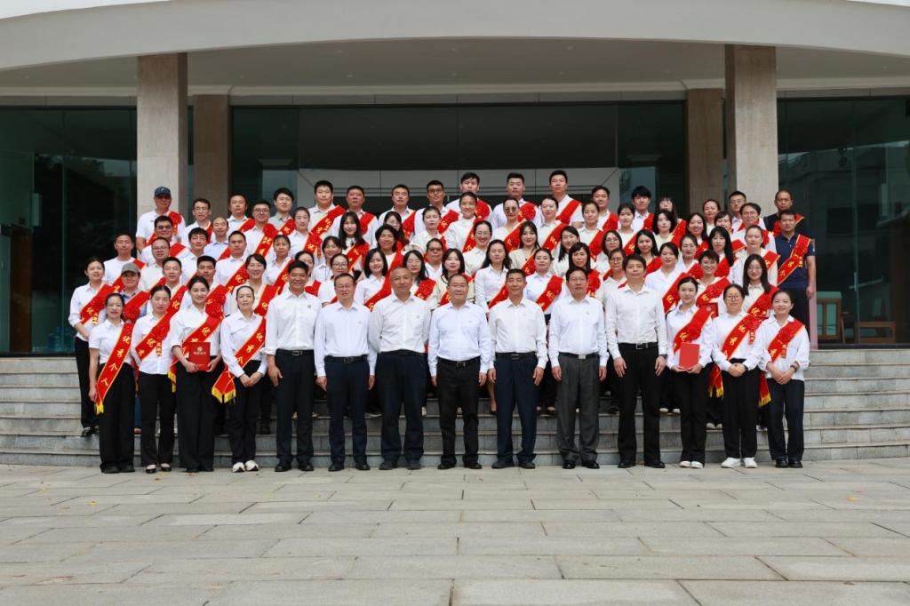 活动结束后,校领导与先进集体代表、个人在学校综合楼前合影留念。