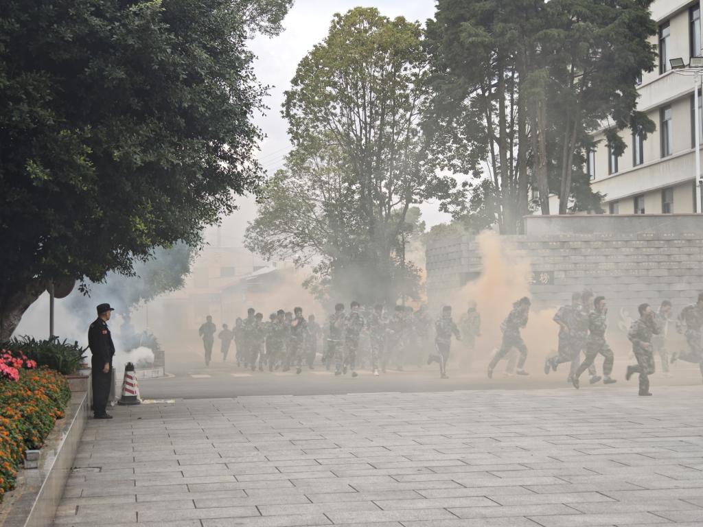消防演练环节中,随着急促的警铃声响起,全体新生在宿管和承训教官的指引下,按照火场逃生的规范及动作要领,快速、有序地疏散到室外空旷地带。结束后,官渡区消防救援大队的教员首先向全体师生展示火场灭火、救援实操等模拟演练内容。其次,深入讲解手提式干粉灭火器、室内消火栓箱、灭火毯、防毒面具等消防器材的使用方式,以及日常生活中如何防范消防安全隐患并正确处置突发情况。最后,指导学生正确使用灭火器并开展灭火实操。