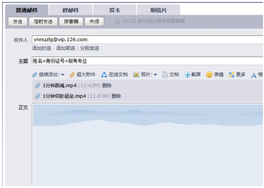 开始考试前,考生手持身份证于胸前置于镜头内、身份证信息和头像清晰可见,报告自己的姓名及身份证号码、报考专业。服装方面要求穿着运动服,款式和颜色不限。视频当中必须同时出现考生本人及秒表计时器(可用手机或秒表计时)。每段视频长度控制在1.5分钟以内,文件小于50M,文件格式为MP4,视频分辨率不低于960*544,两个视频文件分别命名为:1分钟跳绳、1分钟仰卧起坐(先后顺序不限)。视频文件一律采用QQ邮箱超大附件模式发送,视频录制现场要求安静且采光良好,测试内容的视频必须完整,视频不允许有剪辑或者修改等痕迹,要求一次录制完成,考生可多次录制,选取自己认为最好的一次上传邮件,发送视频邮件地址为:ynnuzlg@vip.126.com