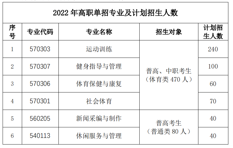 2022年best365高职单招计划招生550人,各专业具体招生名额以上级实际下达计划数量为准;计划6个专业面向高职单招考生招生,其中普通类专业2个:新闻采编与制作、休闲服务与管理;体育类专业4个:运动训练、健身指导与管理、体育保健与康复、社会体育。