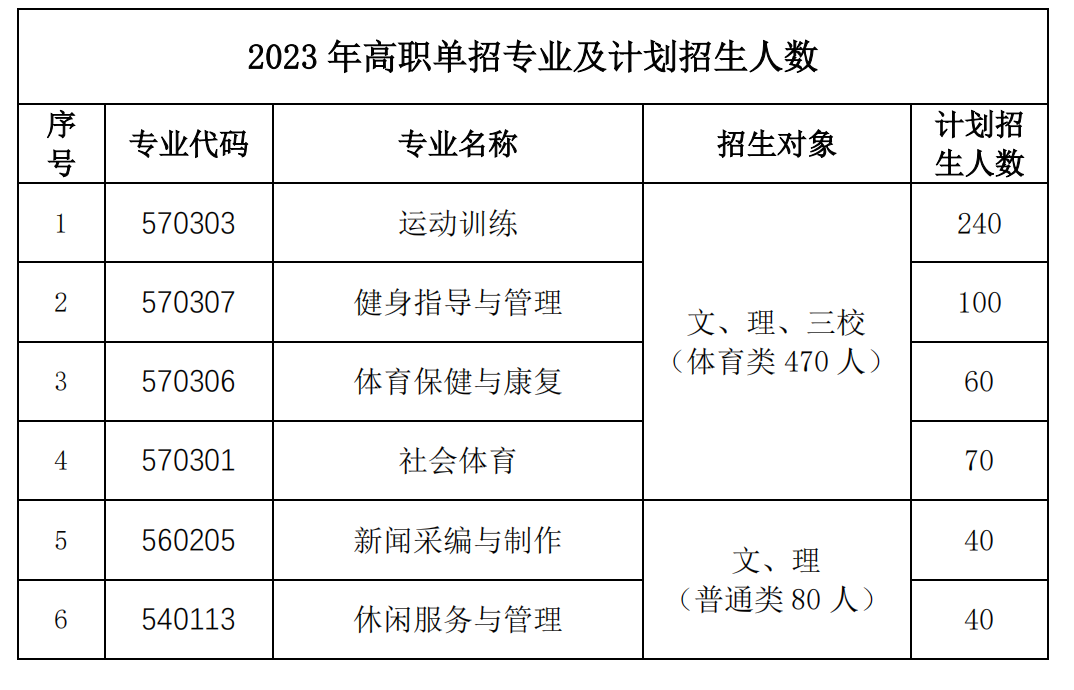 2023年best365高职单招计划招生550人,各专业具体招生名额以上级实际下达计划数量为准;计划6个专业面向高职单招考生招生,其中普通类专业2个:新闻采编与制作、休闲服务与管理;体育类专业4个:运动训练、健身指导与管理、体育保健与康复、社会体育。