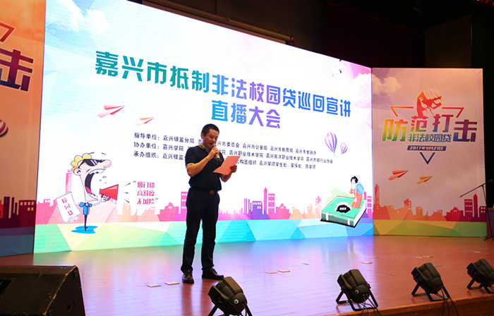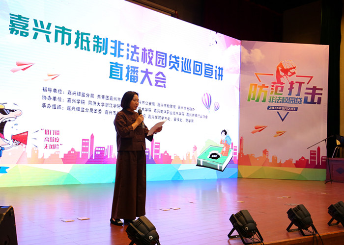 宣讲会上,浙江省金融团工委代表周佳茵为嘉兴银监分局团委授牌嘉兴金融知识讲师团。嘉兴银监分局团委还组织了微课堂、互动问答、小品、RAP歌曲、合唱等形式多样、内容丰富的节目来宣传抵制非法“校园贷”的危害,潜移默化中让学生认识到校园贷存在的安全缺陷和风险漏洞,名为低门槛,实为高风险合同涉嫌欺诈等使大学生成为部分网贷平台待宰的羔羊的招数。