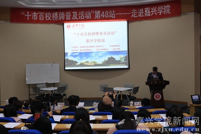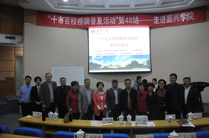 1115日下午,由国家体育总局棋牌运动管理中心、中国桥牌协会主办的“十市百校校园桥牌普及活动”第48站在嘉兴学院顺利举行。浙江省桥牌协会主席寿剑刚、中国桥牌协会副秘书长李国华、学校党委副书记严从荃出席活动。桥牌世界冠军、世界特级大师古玲,世界大师朱小音,亚运会桥牌冠军、必赢官网90届毕业生杨京晖等嘉宾作为桥牌普及推广大使参加活动。