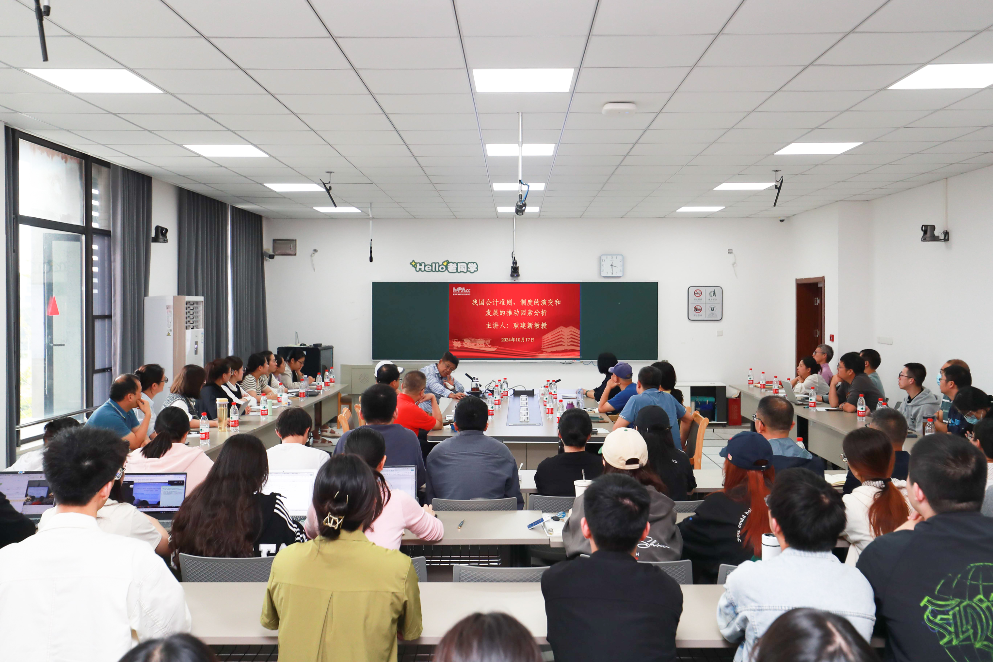 耿建新从亲身经历的我国会计制度向会计准则体系演变过程讲起,回顾了我国会计准则与会计制度的演变、发展轨迹,从科学技术发展、民众生活变化、环境社会进步等三方面详细讲解了会计制度、准则的推动因素,为在座师生呈现了一场学术盛宴。耿教授希望与会师生能从讲座内容中总结自己的体会和思考,并勉励师生在自己的工作岗位上取得更大的成就,并且可持续地坚持下去。整场讲座耿教授激情满满,语言幽默,抑扬顿挫赢得阵阵掌声讲座内容充实、新颖,极具启发性,现场讨论热烈,学术氛围十分浓厚。