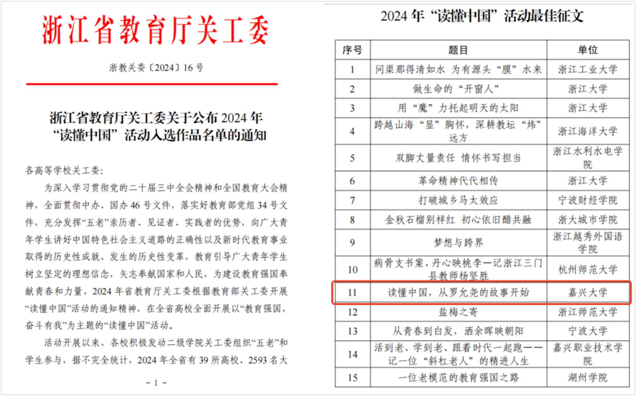 近日,浙江省教育厅关工委公布了2024年“读懂中国”活动获奖名单。院推荐作品《读懂中国,从罗允尧的故事开始》(作者:工商211吕凯;指导教师:李雨嘉;采访对象:罗允尧 578 篇作品中脱颖而出,被评为2024 年“读懂中国”活动优秀征文。