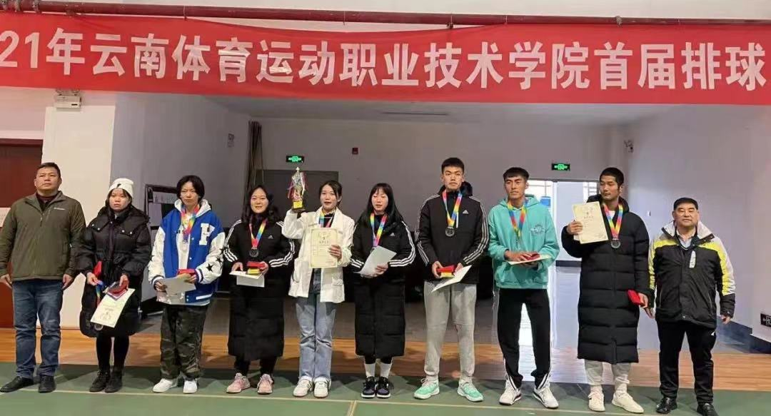 (图为社团成员夺得校园排球比赛混合组冠军颁奖)