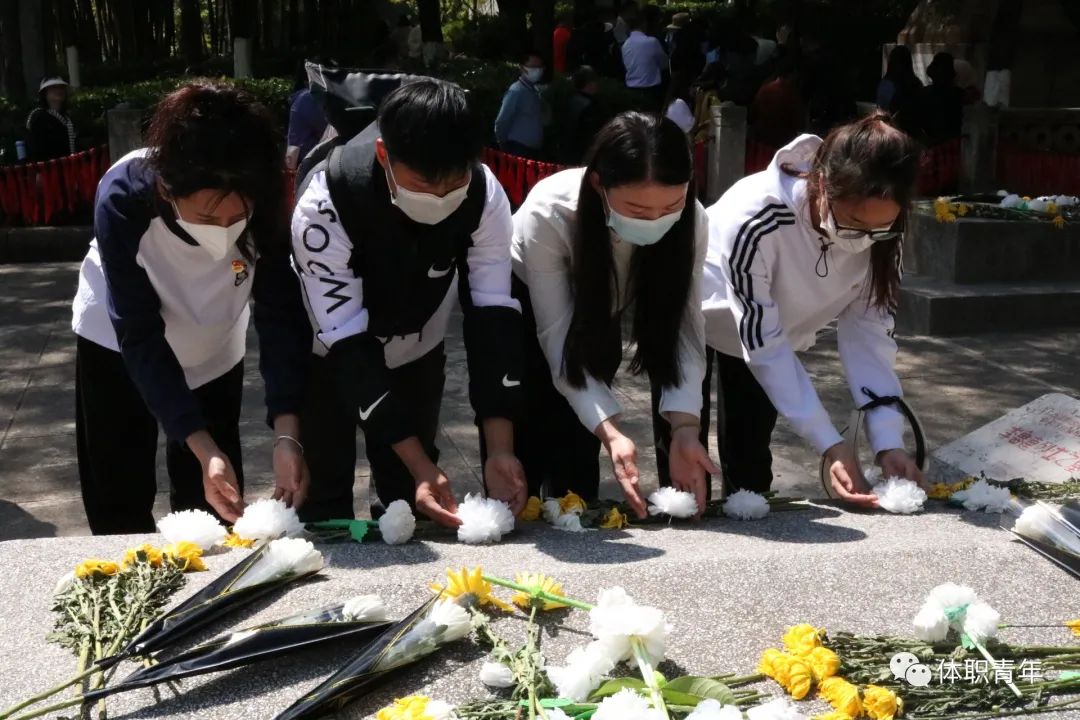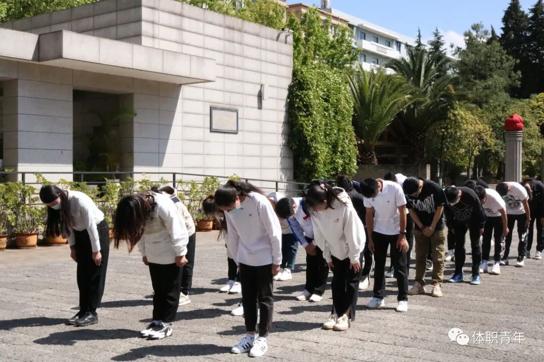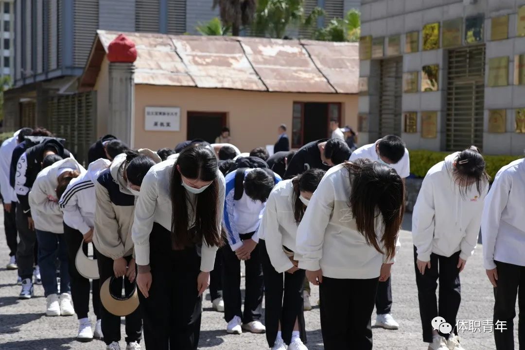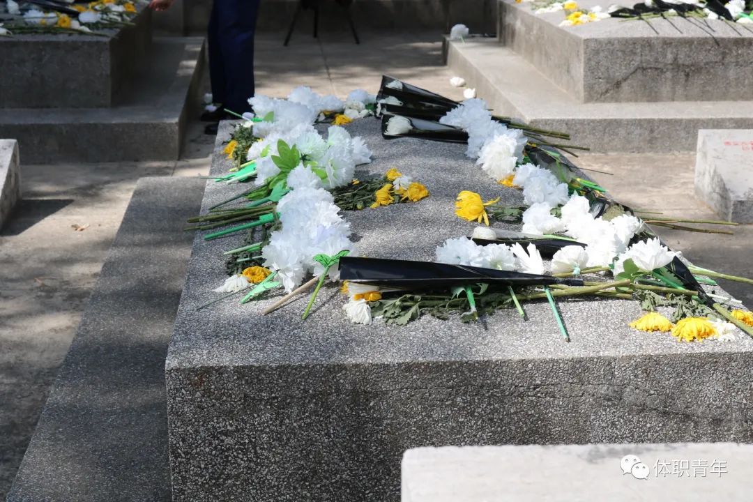 参加祭奠仪式的团员青年和团干部代表在革命烈士纪念碑前向烈士默哀,行鞠躬礼。