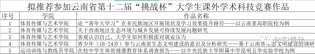 为贯彻落实党的二十大精神,深入实施科教兴国战略、人才强国战略、创新驱动发展战略,进一步引导best365学生努力培养科学精神和科学态度,积极学习科学知识和科学方法。按照第十八届“挑战杯”全国大学生课外学术科技作品竞赛工作部署和《云南省第十二届“挑战杯”大学生课外学术科技节实施方案》要求,结合学校实际,best365已完成2023年度“挑战杯”大学生课外学术科技竞赛作品的评审工作,现对拟推荐参加省赛的作品进行公示。