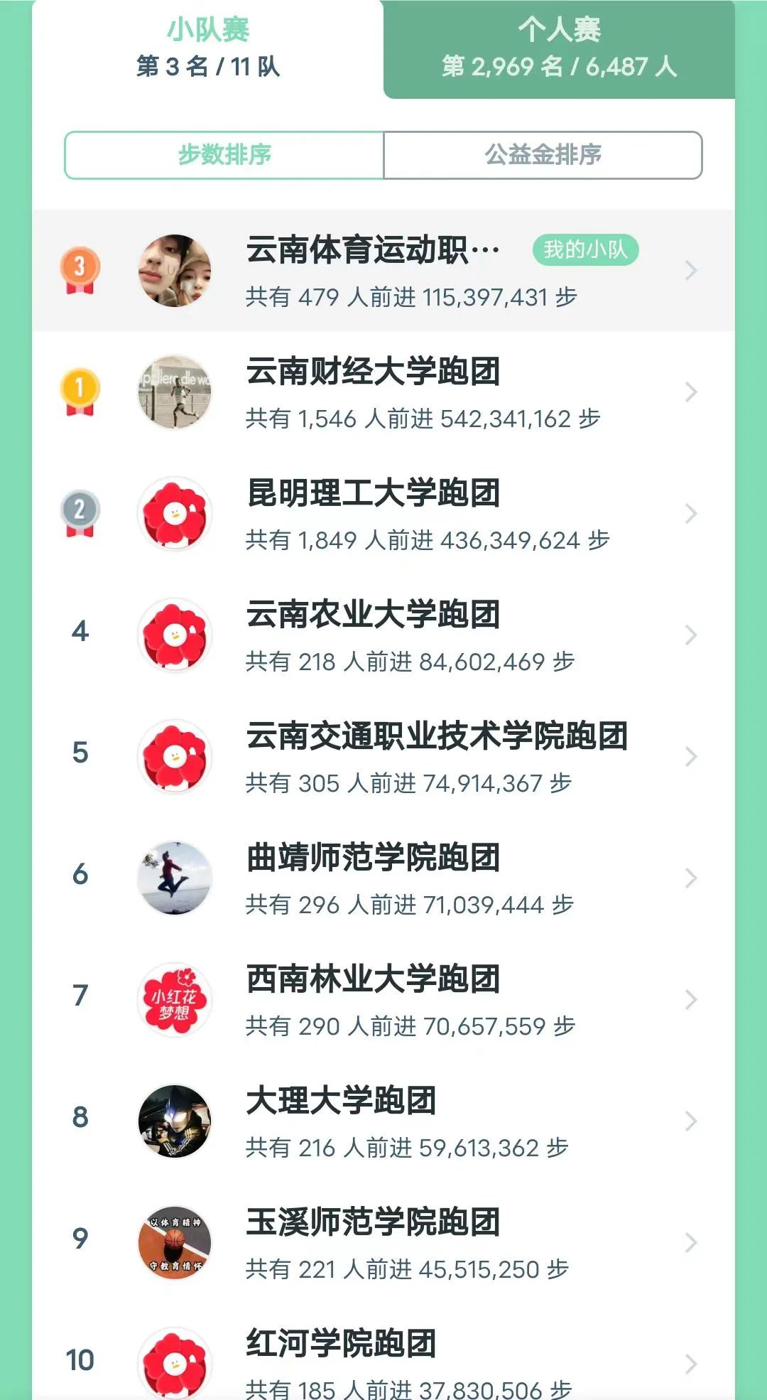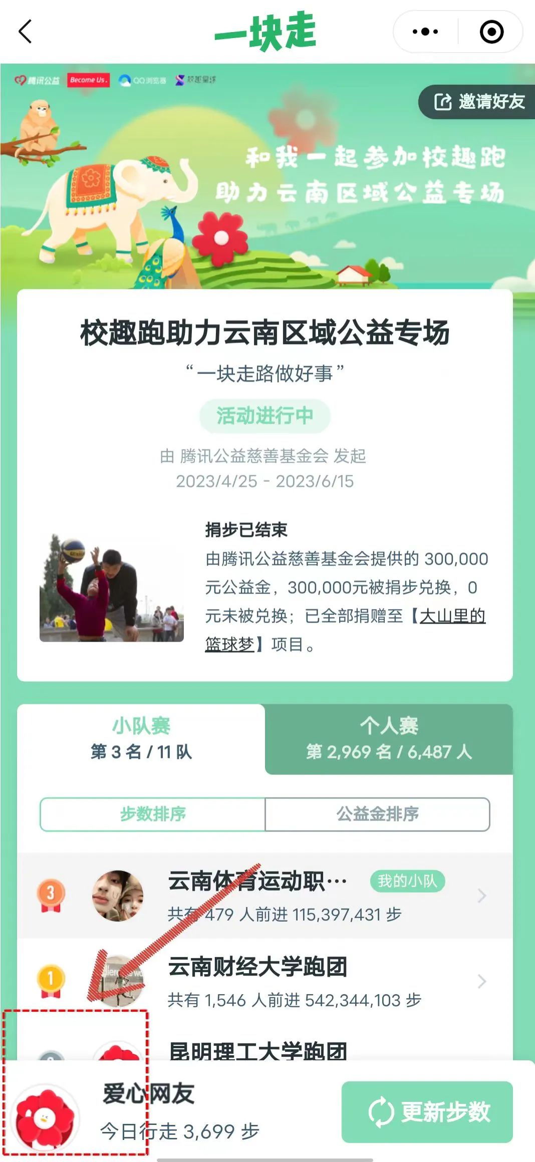 30天的征程结束了,云南区域累计有11所高校参与本次“腾讯公益 x 校趣跑 云南区域公益专场”活动,累计有6489人加入一块走跑团,为【大山里的篮球梦】公益项目捐出30万公益金。