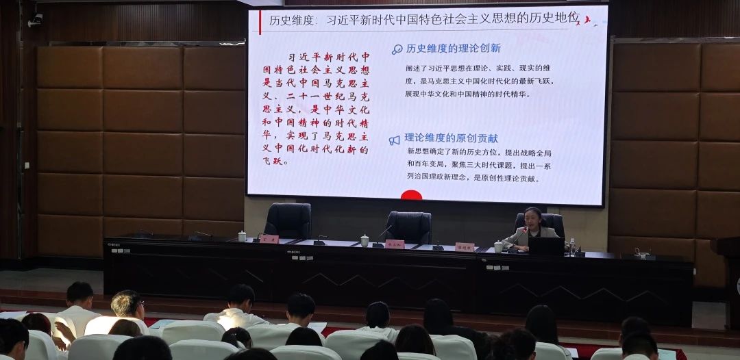 开班仪式结束后,马克思主义学院杨艳萍教师围绕“习近平新时代中国特色社会主义思想产生的历史逻辑”开展第一堂课授课。她分别从马克思主义中国化时代化的历史进程、中国共产党百年奋斗的历史经验、新时代新的历史方位、习近平新时代中国特色社会主义思想的历史地位等四个维度展开了授课。