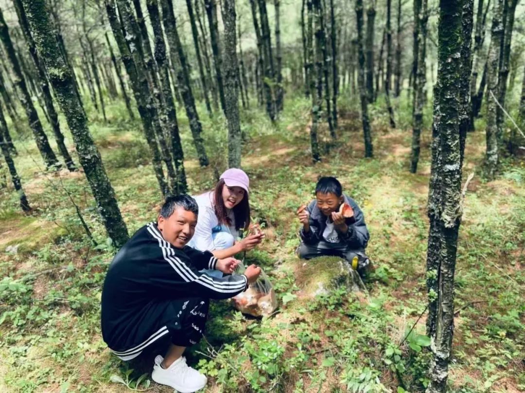 假期,李昱萱和孩子们在树林里采菌子