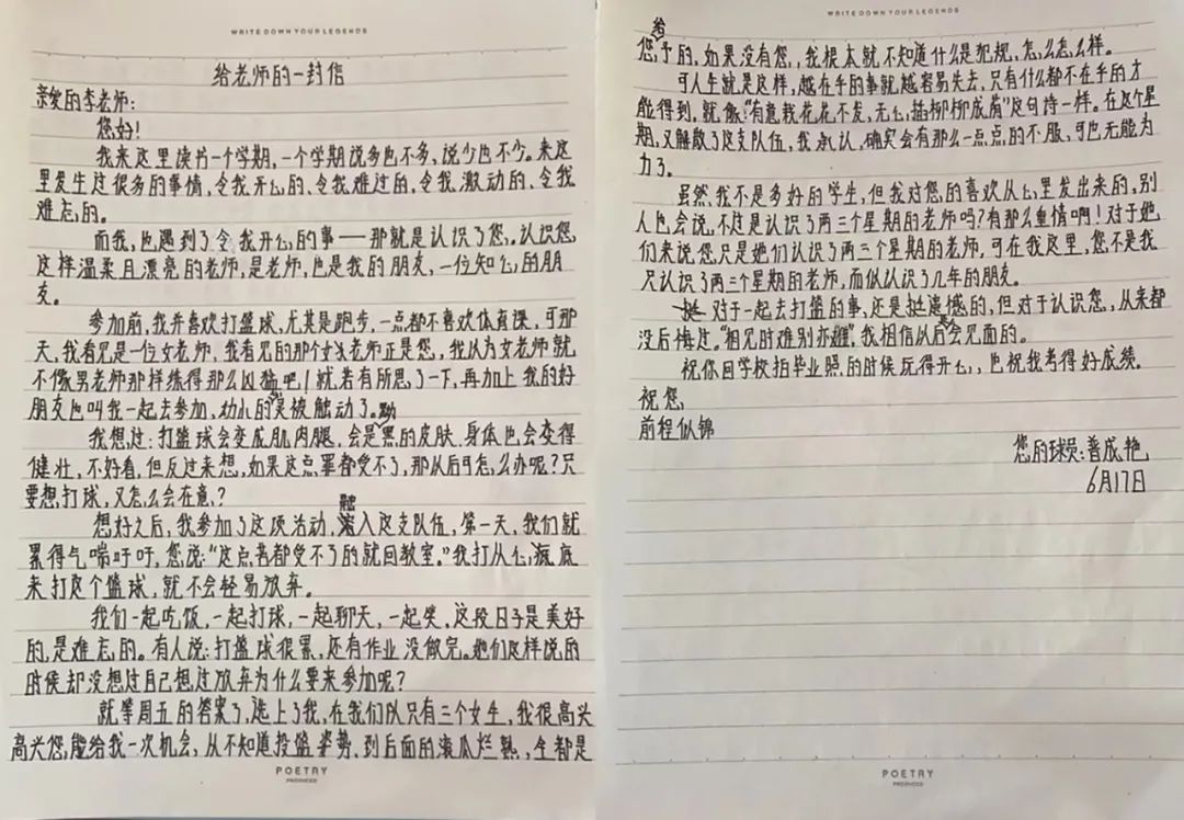 一开始是普成艳,这个从来不喜欢体育的小个子女生,给李昱萱写了第一封信。她在文字间表白“从没想过会遇到一个教体育的女老师”。看到女老师组建篮球队,她有点心动了,她喜欢这个大姐姐,但又怕自己被拒绝。写信的那天正好被龙俊涛看到,然后很快,六年级参加李昱萱篮球队的孩子们每人都自发写了一封信给她。
