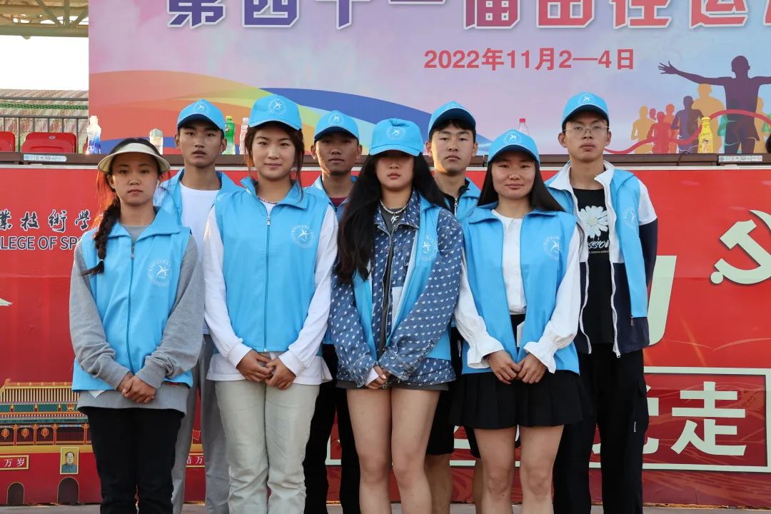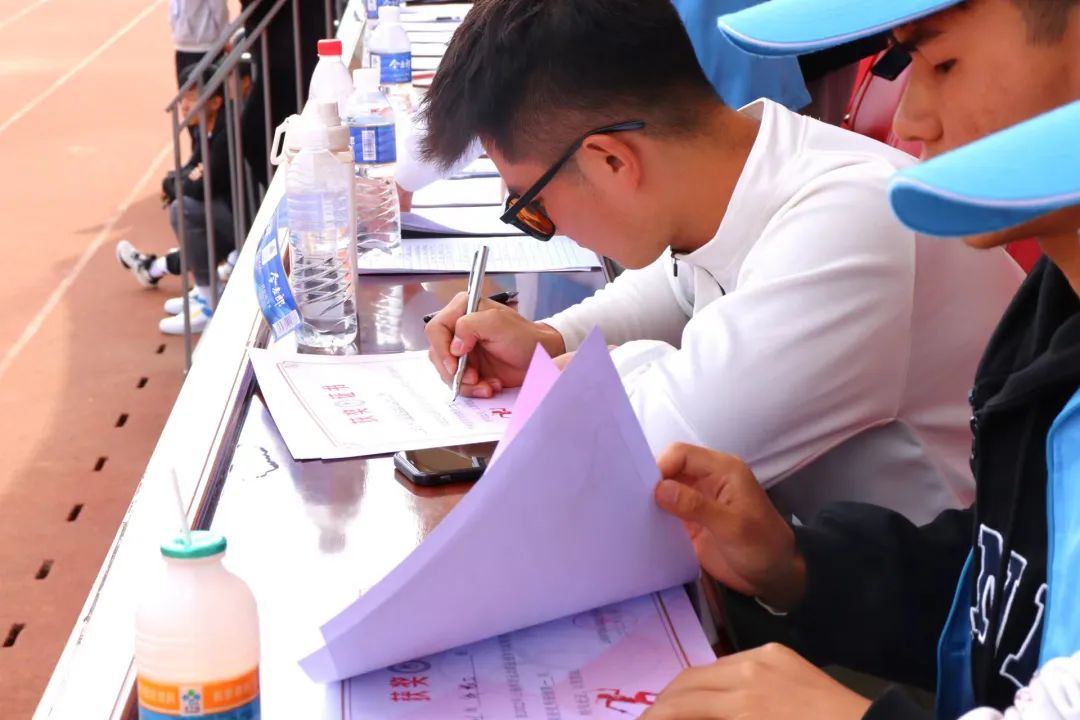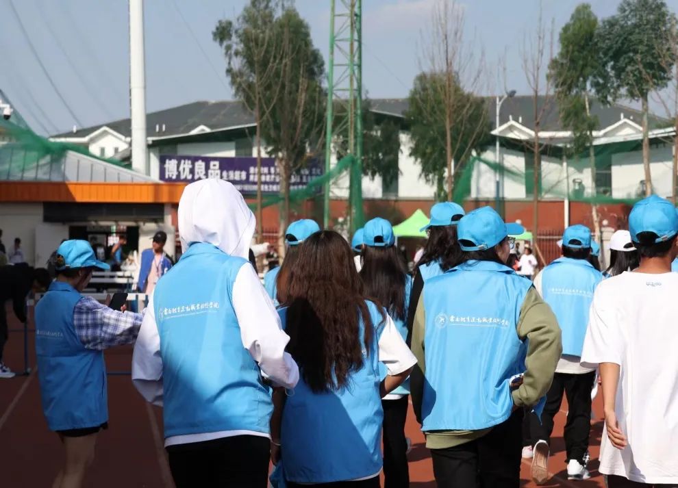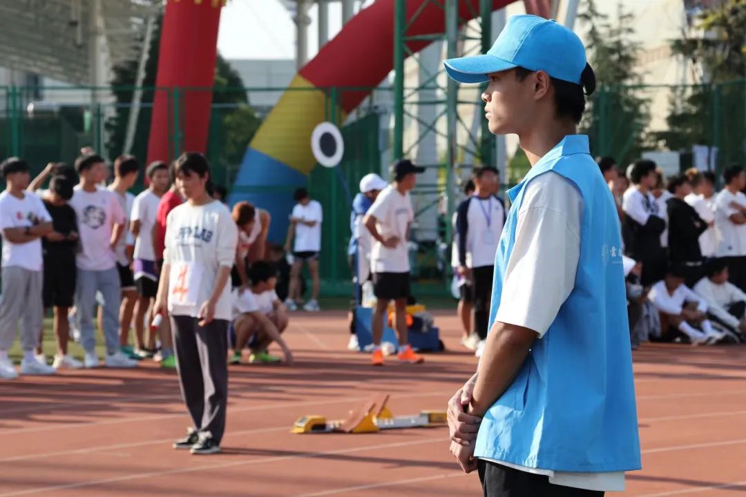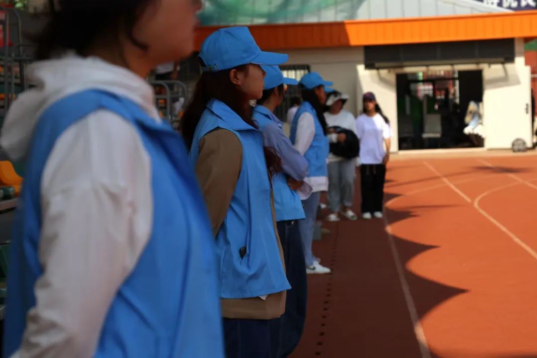 跑道上,一个个蓝色身影奔跑着来来回回地为运动员拿衣递水,志愿者们用最大的耐心与热忱维持着比赛场地的秩序,传递着青春的友爱,保证比赛的顺利进行。