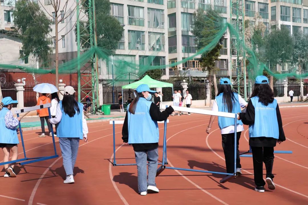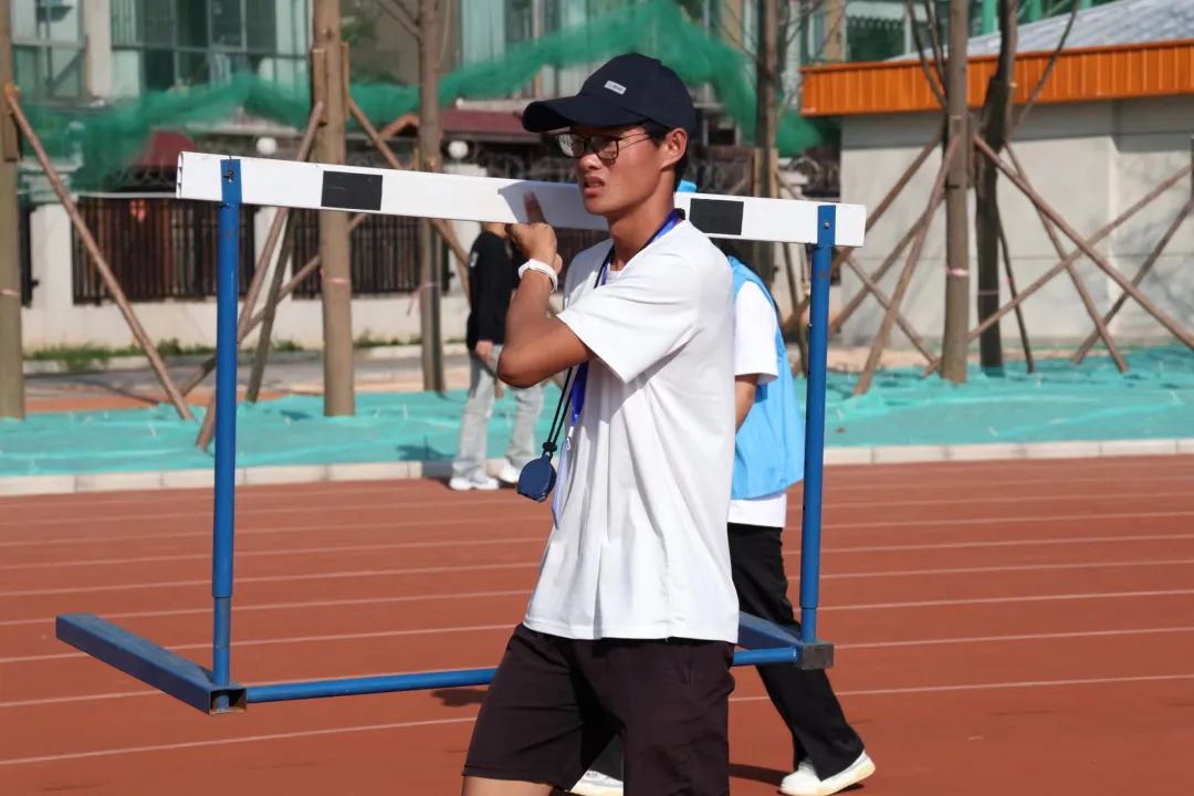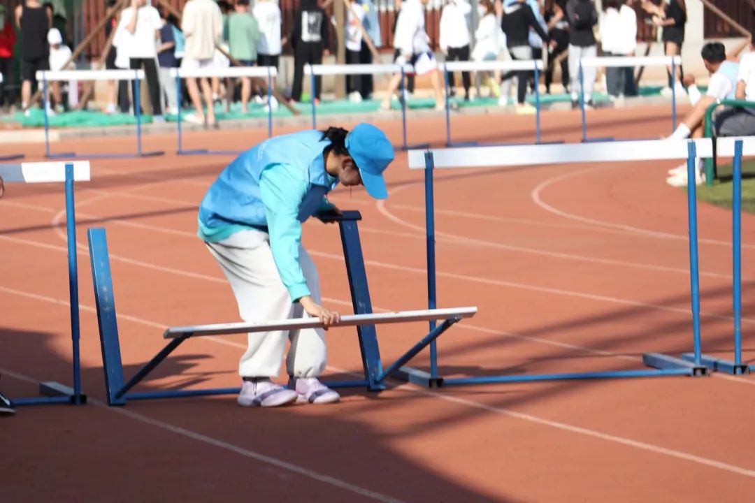 志愿者们搬运体育器材、清扫赛场垃圾、维持跑道秩序。到场最早的是他们,离开最晚的也是他们。