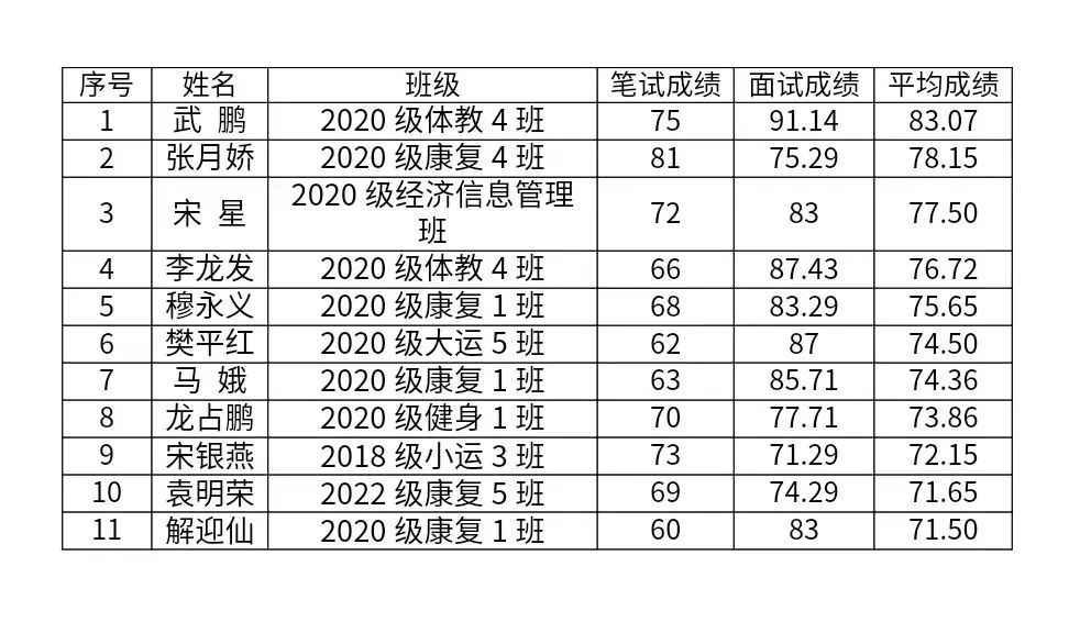 根据共青团云南省委下发关于印发《2023—2024年度云南省大学生志愿服务西部计划实施方案》的通知(云青联〔2023〕10号))文件要求、2023-2024年度云南省西部计划项目办的工作总体安排,结合学校实际情况,按照学校关于印发《关于2023—2024年度大学生志愿者服务西部计划志愿者招募考试相关工作的通知》和《2023—2024年度best365中国官方网站大学生志愿服务西部计划实施方案》文件要求,现将2023—2024年度学校大学生志愿服务西部计划志愿者招募考试,参加面试考生的成绩予以公示。