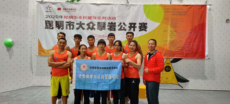 2020年10月17日,以社会体育与体育管理学院社会体育专业组建的攀岩队代表学校参加了“昆明市攀岩公开赛”,荣获7金8银3铜的好成绩,同时获得昆明市总会颁发的“体育道德风尚奖”;另派出11名学生参加裁判工作。