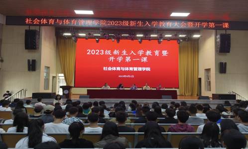 9月1日上午,社会体育与体育管理学院2023级新生入学教育暨开学第一课在学生礼堂举行。社管学院党总支书记杨雪雯,院长司文琴及全体领导班子出席会议,会议由社管学院专职副书记杨潇主持。大会共分为三个阶段:第一阶段由社管学院全体班子成员从各自的工作角度进行了新生入学教育;第二阶段由各专业带头人介绍各专业特色、亮点及就业方向;第三阶段由新生班级专职辅导员杨丽蓉从《学生手册》及相关日常管理方面,做“开学第一课”的讲授。