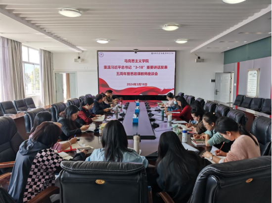 会议强调,习近平总书记“3·18”重要讲话,深刻阐明了学校思政课的重大意义,就如何办好新时代思政课作出部署、提出要求,为思政课建设提供了根本遵循。马克思主义学院全体教师要增强自信,始终牢记习近平总书记政治要强、情怀要深、思维要新、视野要广、自律要严、人格要正的“六要”要求,对照“八个相统一”的标准着力推动思想政治理论课程改革创新,推动马克思主义学院各项工作实现新的突破、取得新的进展。