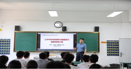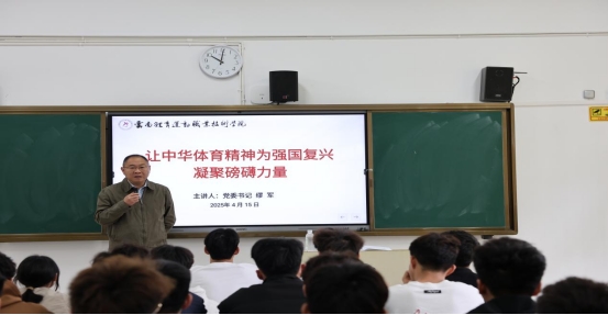 党委书记缪军以“让中华体育精神为强国复兴凝聚磅礴力量”为题,讲述了中华体育精神的形成与发展历程,并通过中国体育健儿在国际赛场奋勇争先、为国争光的生动事例,深刻诠释了中华体育精神是激励一代代中国人砥砺前行的强大动力,鼓励学生要自觉做中华体育精神的传承者、弘扬者和践行者,把赛场上的拼搏精神转化为刻苦学习、苦练技能、追求卓越的实际行动。