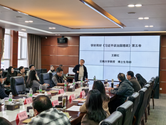 会议由滇池学院马克思主义学院院长杨志玲教授主持。会上,王新红教授以《习近平谈治国理政》第五卷核心思想融入思政课为主题作专题讲座。王教授围绕《习近平谈治国理政》第五卷的核心要义、精神实质和实践要求,结合高校思政课教学实际,深入阐释了将其核心思想融入《习近平新时代中国特色社会主义思想概论》课程的路径方法、重点难点和实践要点,为两校思政课教师精准把握教学方向、丰富教学内容、创新教学方法提供了系统且具指导性的思路,让参会教师深受启发。