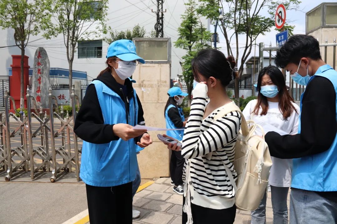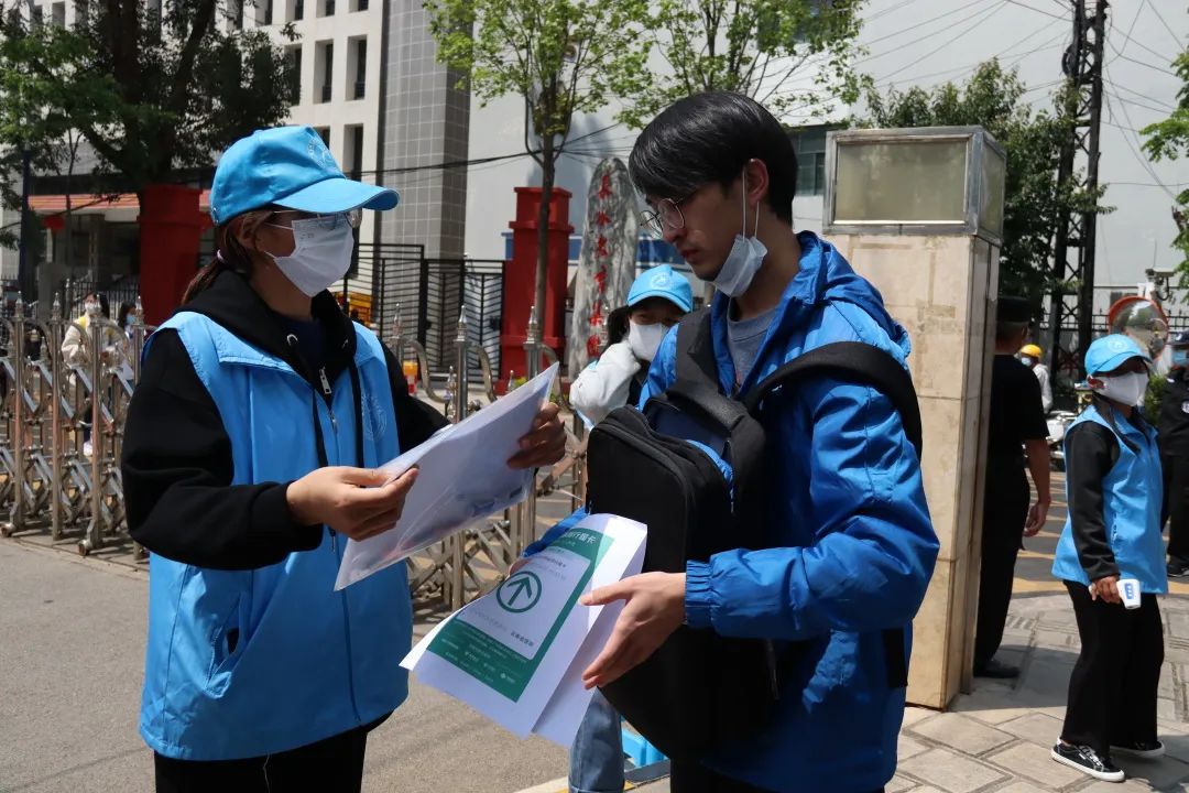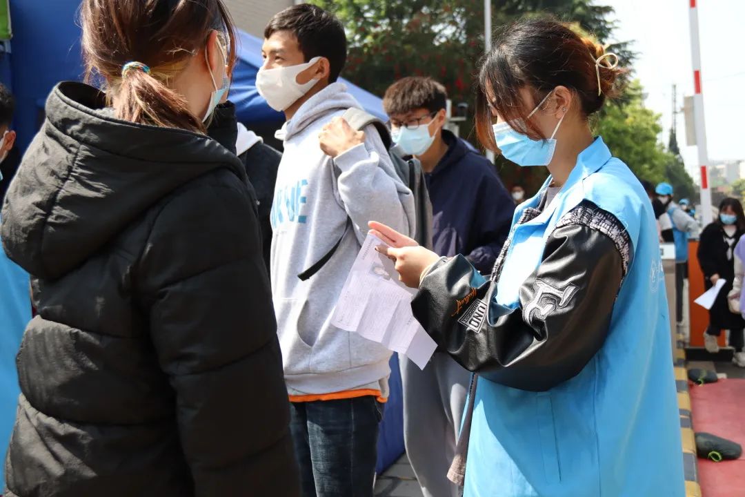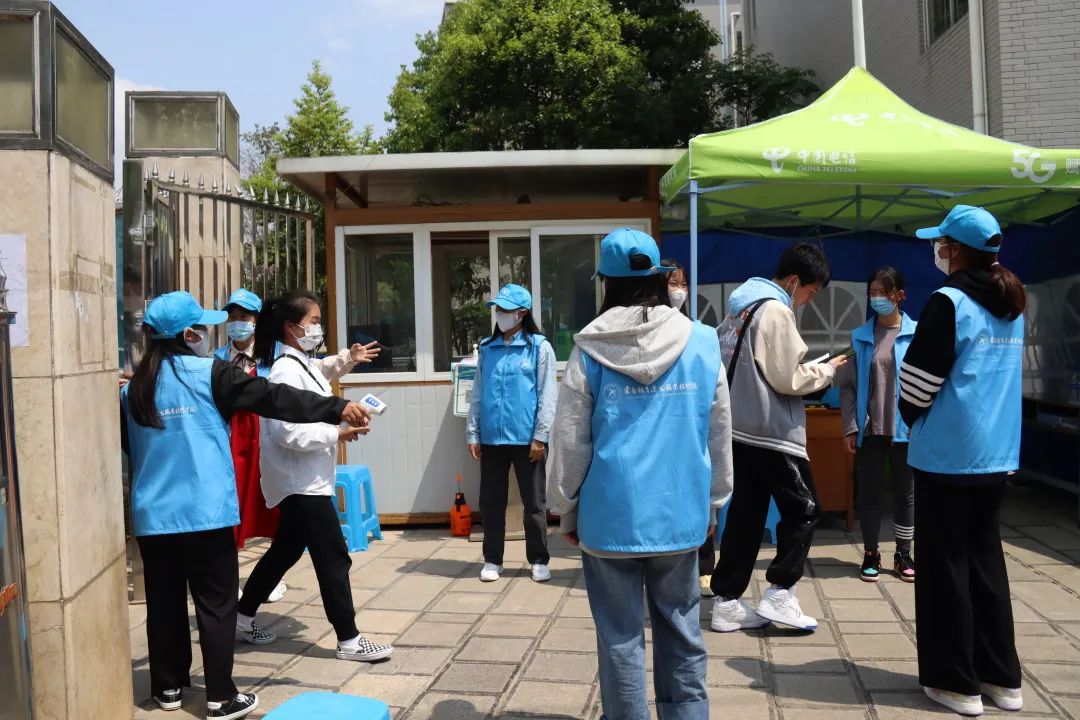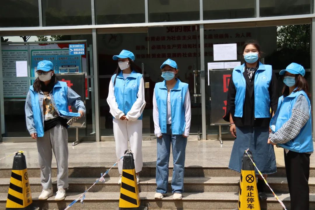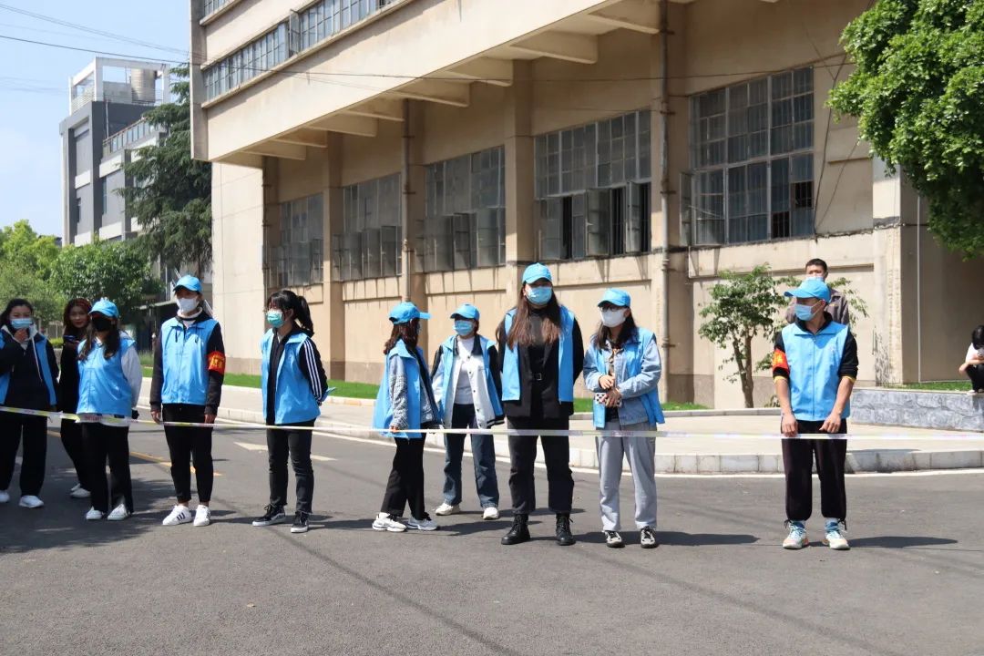 根据疫情防控要求,为减少校内外人员接触,志愿者们分散在各个警戒线路口维持秩序,防止有校内同学进入考生备考区以及防止校外考生进入校园内。