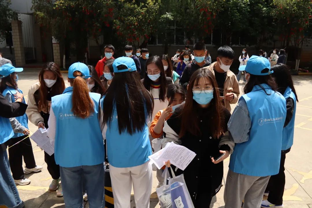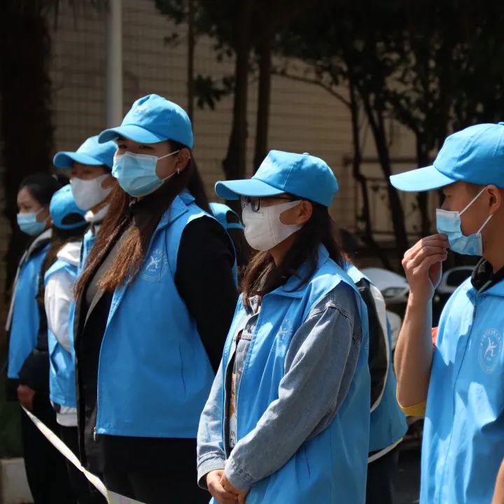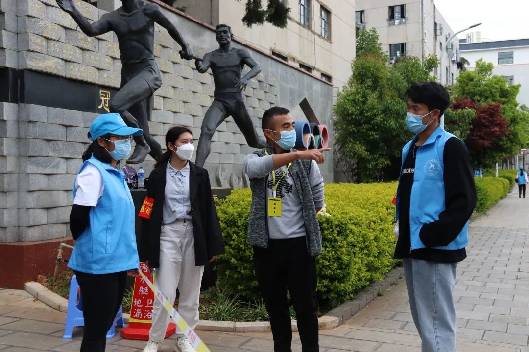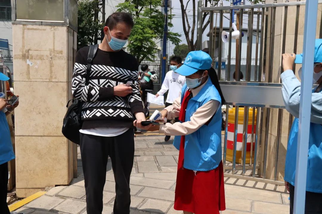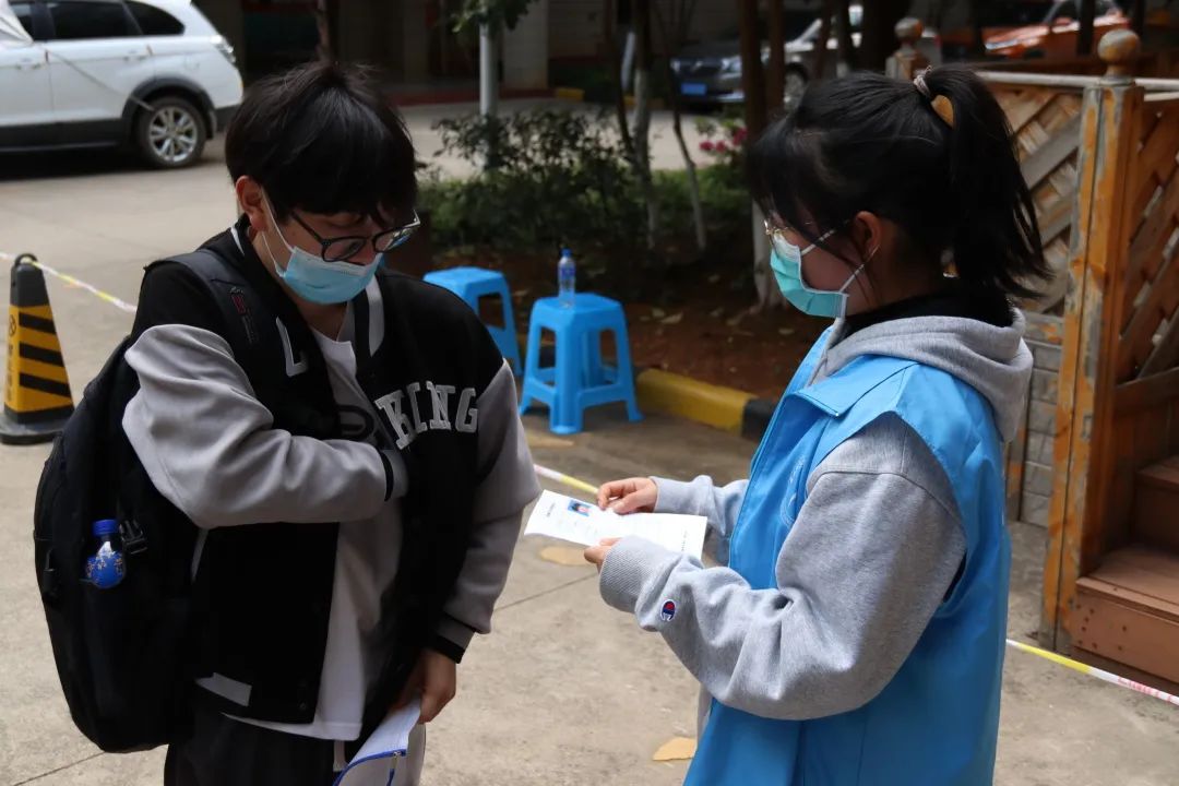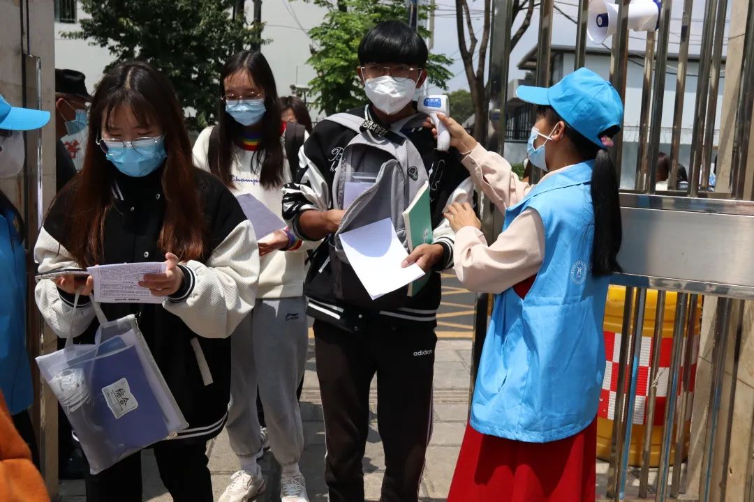根据疫情防控要求,为减少校内外人员接触,志愿者们分散在各个警戒线路口维持秩序,防止有校内同学进入考生备考区以及防止校外考生进入校园内。