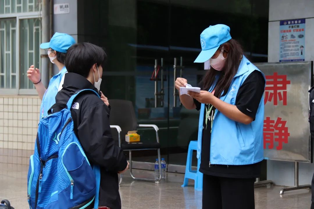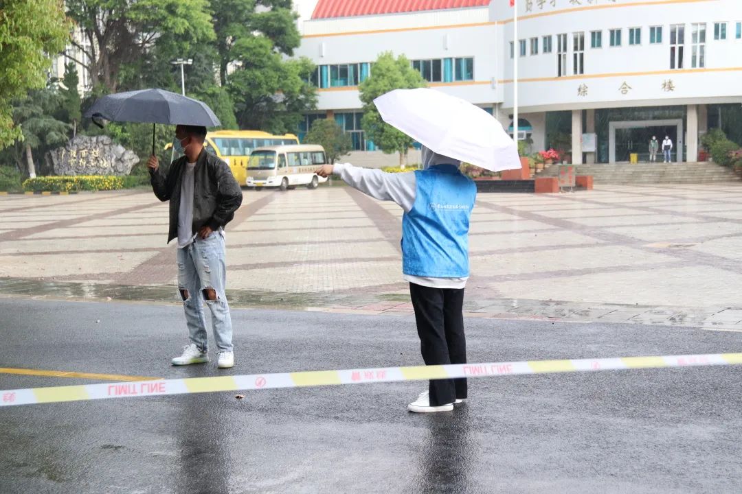 考生进入考场后,校园突然安静了下来。无论是炎炎夏日还是狂风暴雨,志愿者们都坚守在自己的岗位上,为考生保驾护航。考试结束后,志愿者们一遍又一遍,不厌其烦的提醒校外考生出示准考证后尽快离校,不要在学校逗留。