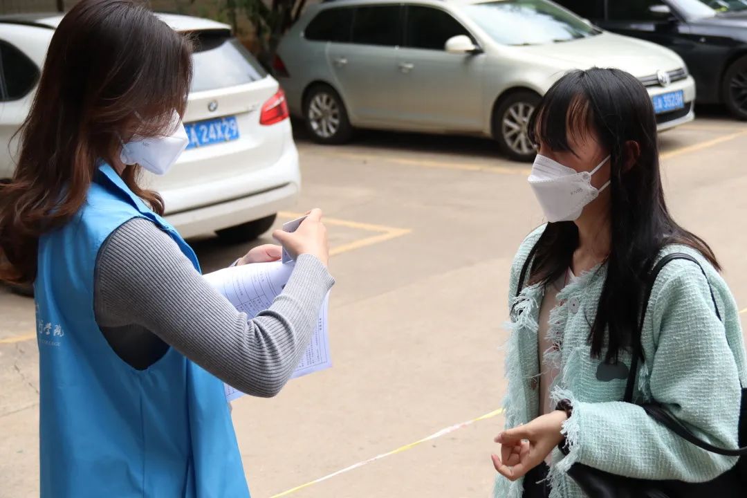 4月9日早上七点,艳阳初升,鸟鸣密林,来自各个学院的30名志愿者们按照分工要求,提前到达指定位置。校门口执勤的志愿者们在消毒区对考生进行酒精消毒,引导考生至“专升本考场专用通道”进行健康码查验、核酸报告查验和体温测量,最后对考生的准考证、身份证等考试证明进行仔细核对后方可进入校园。